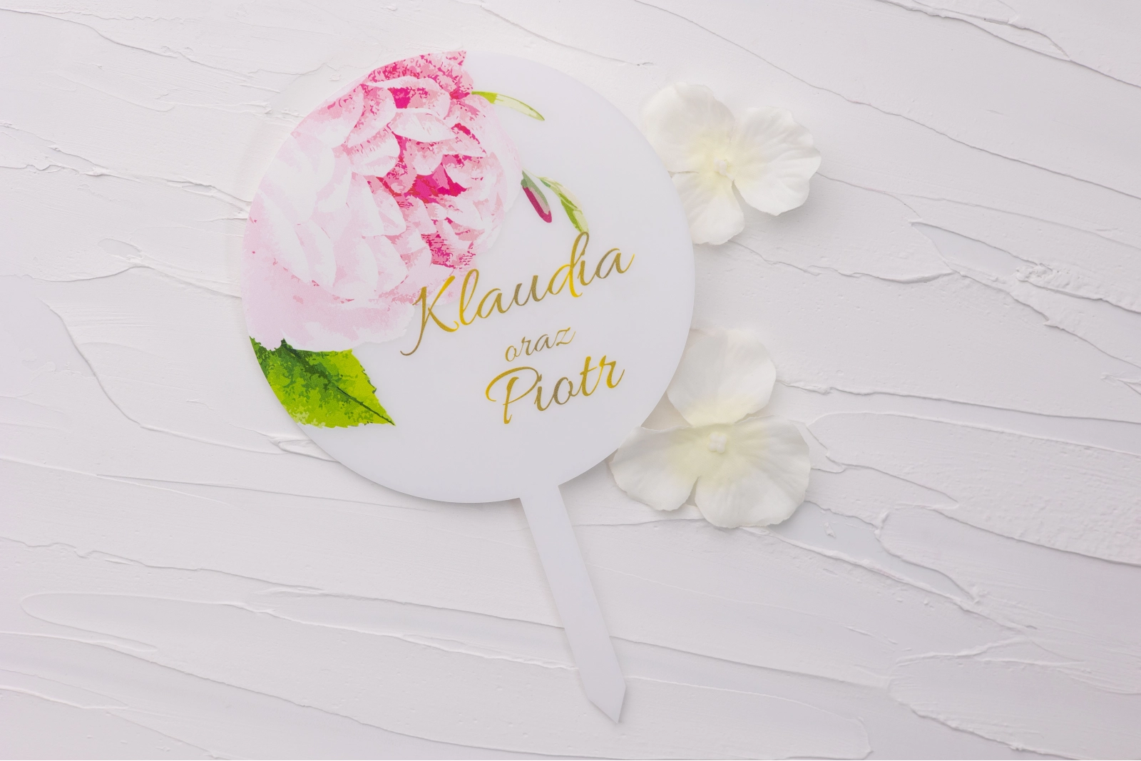 Spersonalizowany topper na tort weselny wykonany ze sklejki drewnianej lub białego akrylu.