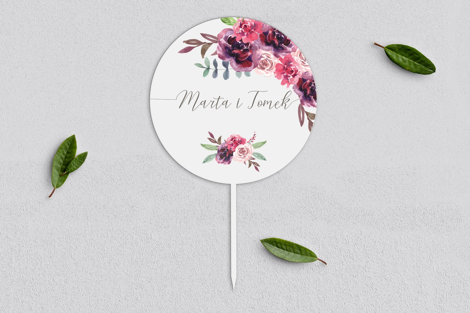 Spersonalizowany topper na tort weselny wykonany ze sklejki drewnianej lub białego akrylu.