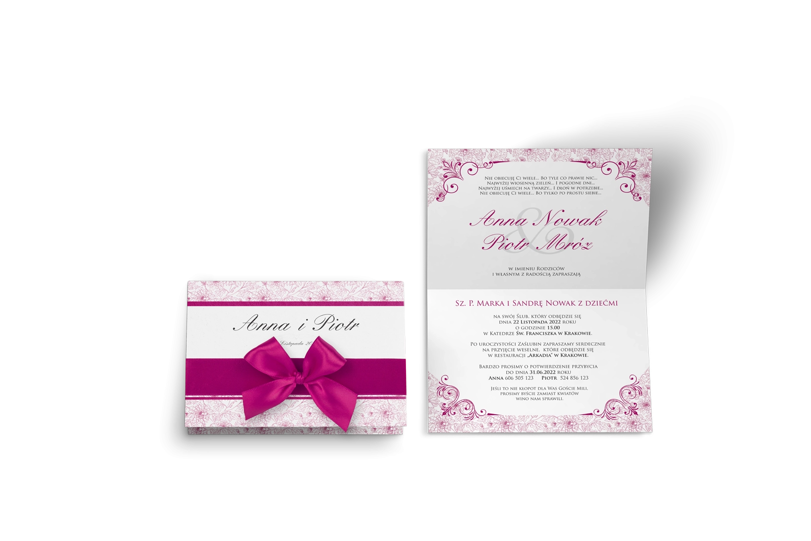 Zaproszenie ślubne Ornaments to elegancja propozycja stworzona w kolorze amarantowym. Główna karta zaproszenia wykonana jest z wysokich jakości papierów o gramaturze od 246 gr do 300 gr. Sami możecie wybrać ich strukturę. Główną aplikacją jest wstążka satynowa przyklejona do zaproszenia w postaci paska, na którym spoczywa misternie i dokładnie zawiązana kokarda. Jako dodatki do tego wzoru możecie wybrać kopertę zwykłą lub koperty krzyżowe z piękną wklejką i kolorową personalizacją. Aby zaproszenie było jeszcze ciekawe polecamy dodać do niego dodatkowe wkładki.