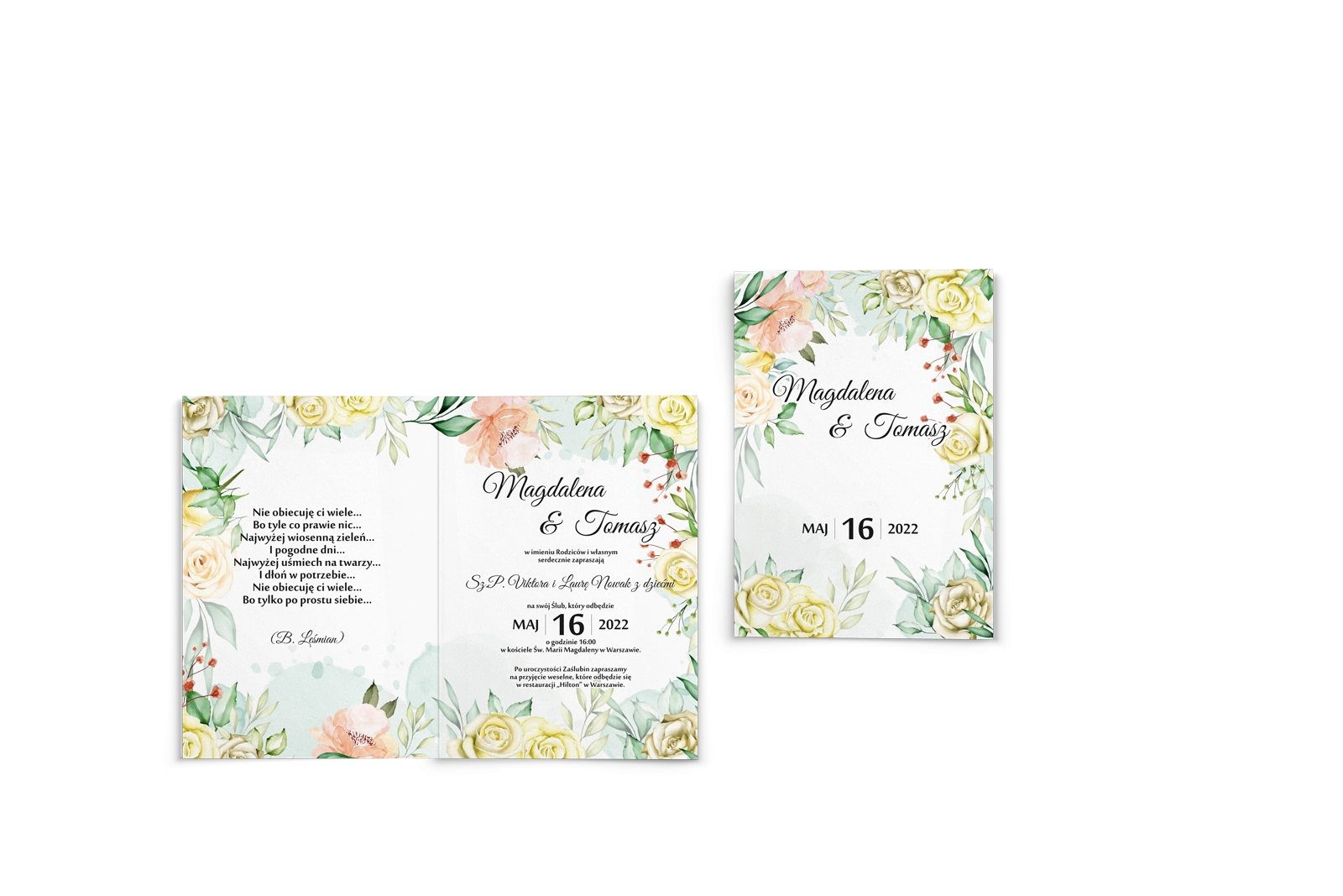 Kwiatowe Zaproszenia ślubne z motywem akwarelowych kwiatów, zamykające informacje weselne w wiosenną ramę.