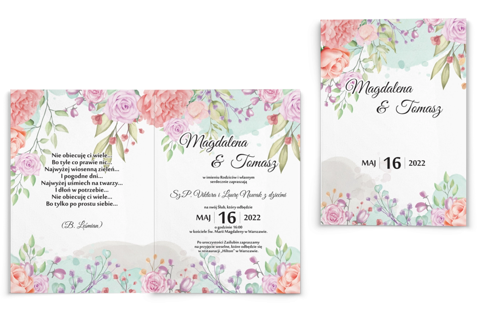 Kwiatowe Zaproszenia ślubne z motywem akwarelowych kwiatów, zamykające informacje weselne w wiosenną ramę.