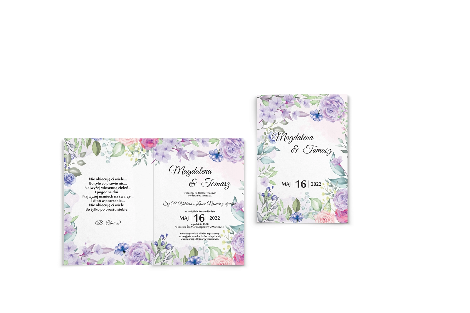 Kwiatowe Zaproszenia ślubne z motywem akwarelowych kwiatów, zamykające informacje weselne w wiosenną ramę.