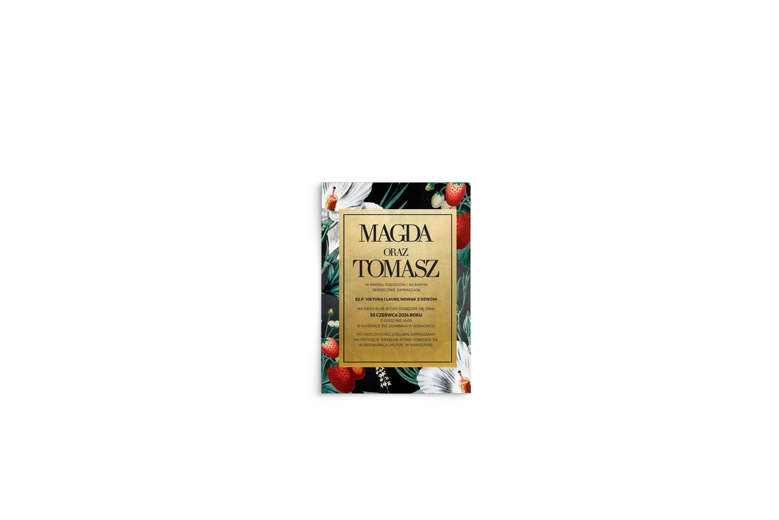 Romantyczne zaproszenia ślubne z kwiatami oraz owocami truskawek pod złotą ramką.