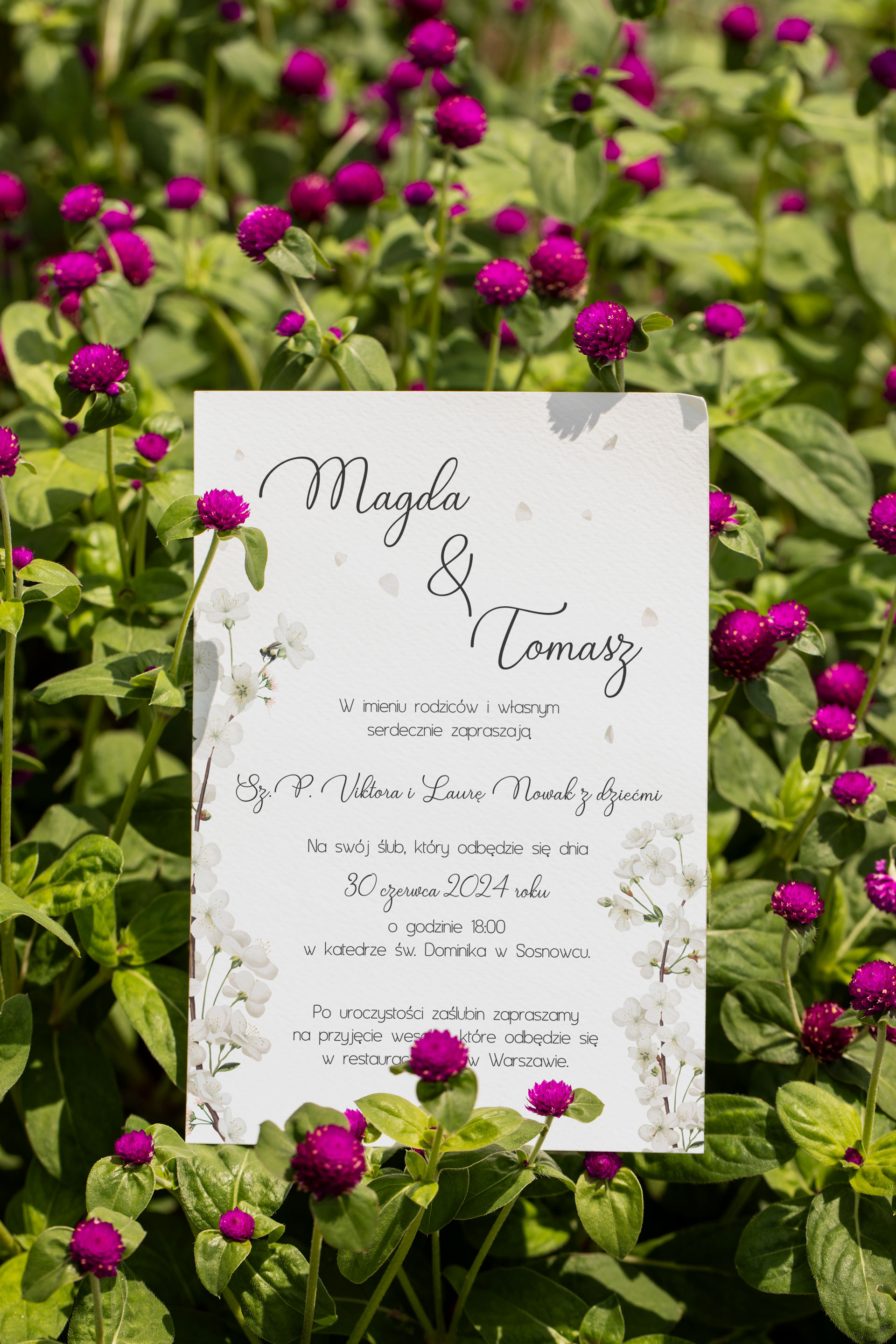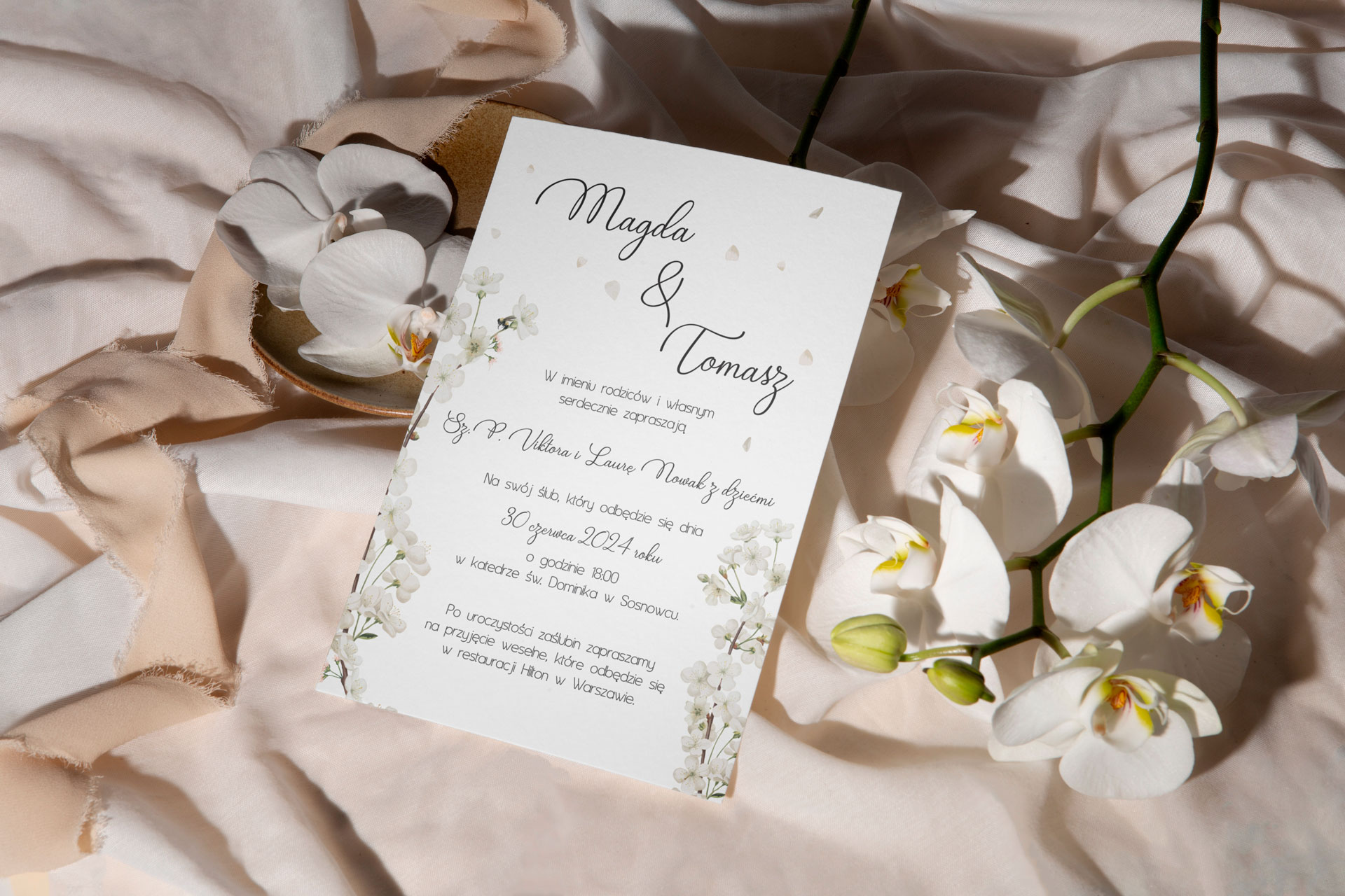 Zaproszenia Biały Czas to piękne połączenie białych kwiatów wraz z cudowną czcionką, która idealnie wkomponuje się w każdy styl wesela.