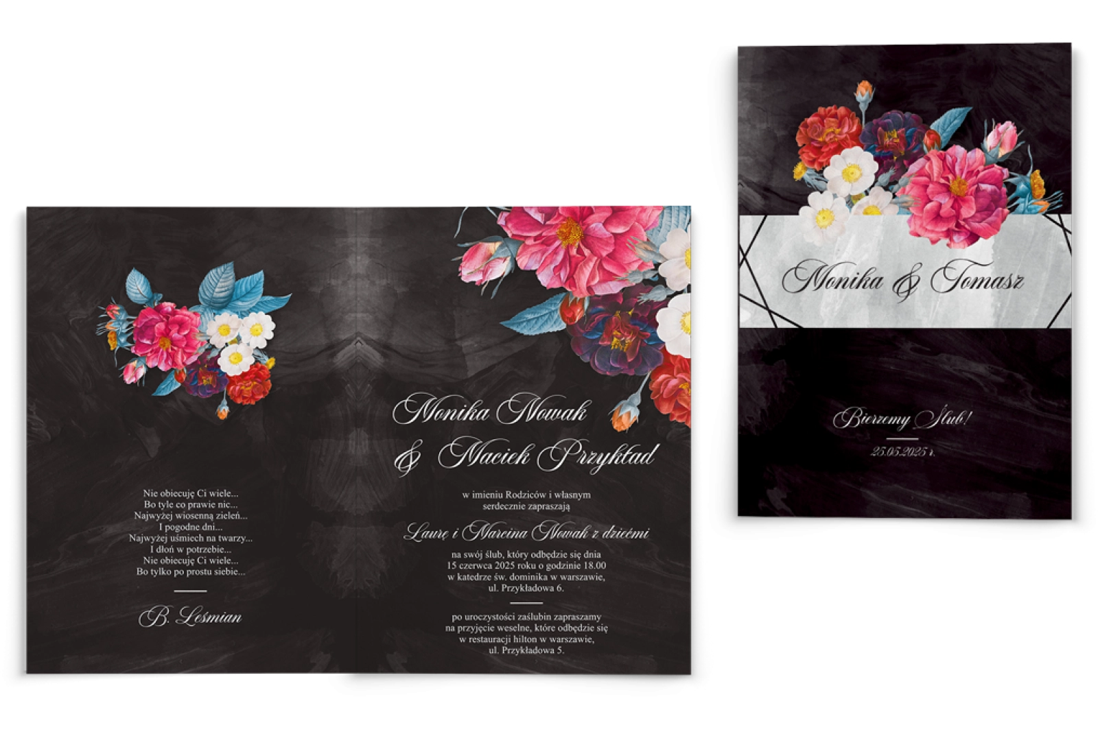 Zaproszenia ślubne Black Flowers - Składane Motyw 1