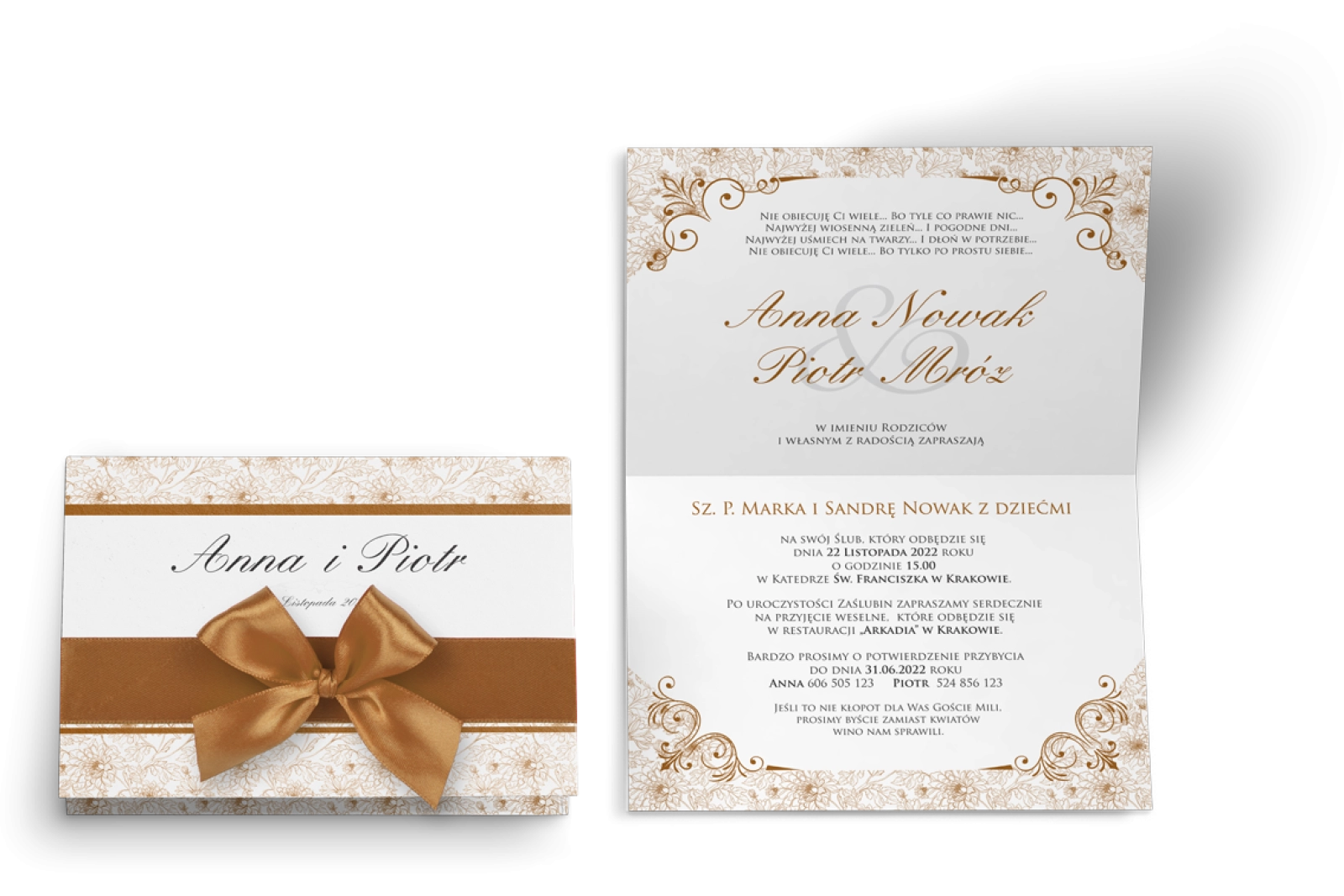 Zaproszenie ślubne Ornaments to elegancja propozycja stworzona w kolorze brązowym. Główna karta zaproszenia wykonana jest z wysokich jakości papierów o gramaturze od 246 gr do 300 gr. Sami możecie wybrać ich strukturę. Główną aplikacją jest wstążka satynowa przyklejona do zaproszenia w postaci paska, na którym spoczywa misternie i dokładnie zawiązana kokarda. Jako dodatki do tego wzoru możecie wybrać kopertę zwykłą lub koperty krzyżowe z piękną wklejką i kolorową personalizacją. Aby zaproszenie było jeszcze ciekawe polecamy dodać do niego dodatkowe wkładki.
