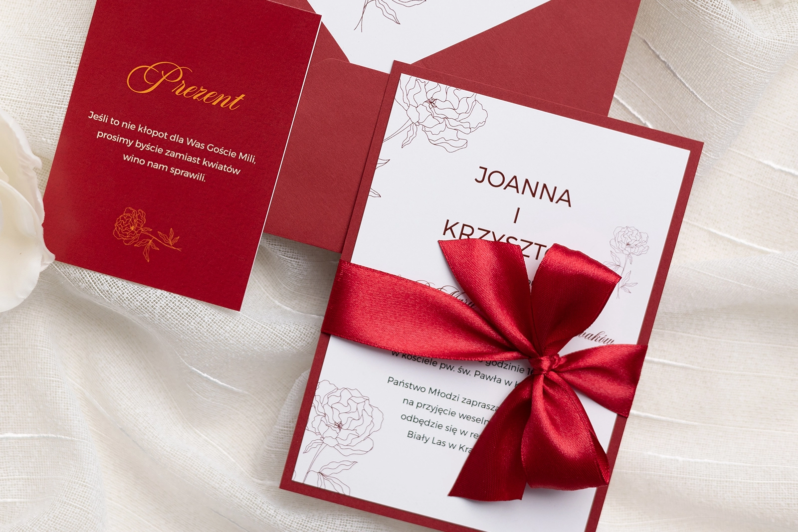 Zaproszenia ślubne Burgundy z papierem ozdobnym i kokardą