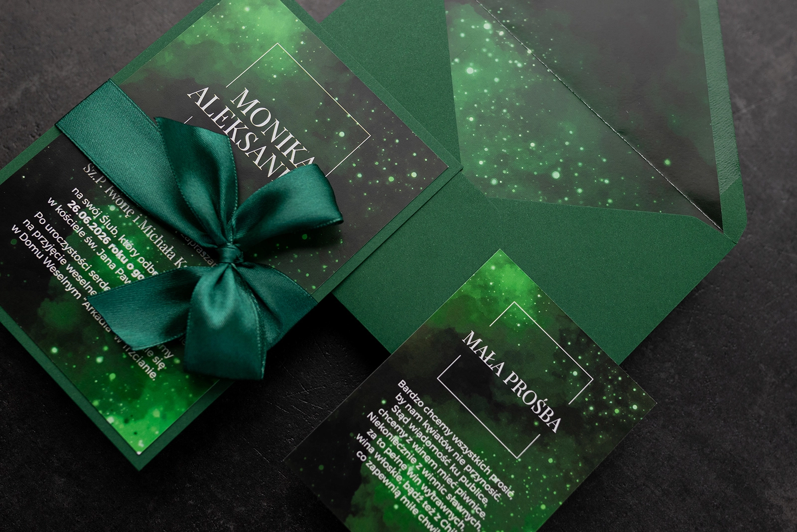 Wszystkie treści zaproszenia oraz dodatkowych wkładek są dowolnie personalizowane. Możesz zmienić każdą treść na swoim zaproszeniu. Podczas wypełniania Formularza Personalizacji opisz nam jak chcesz, aby wyglądało Twoje zaproszenie. Grafik przygotuje projekt skrojony specjalnie dla Ciebie.