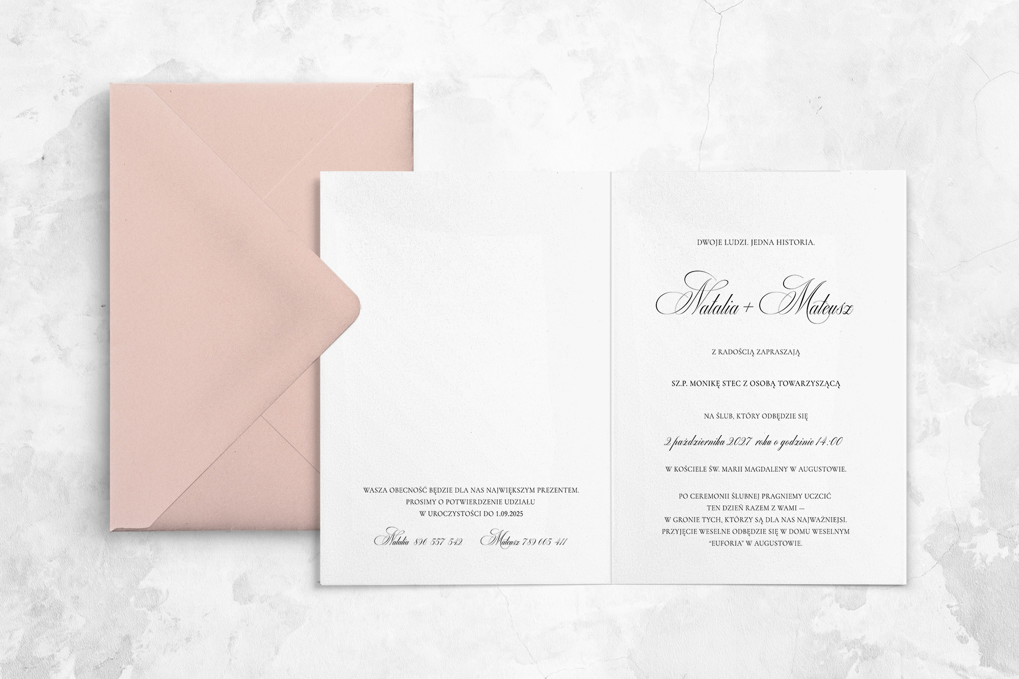 Wszystkie treści zaproszenia oraz dodatkowych wkładek są dowolnie personalizowane. Możesz zmienić każdą treść na swoim zaproszeniu. Podczas wypełniania Formularza Personalizacji opisz nam jak chcesz, aby wyglądało Twoje zaproszenie. Grafik przygotuje projekt skrojony specjalnie dla Ciebie.