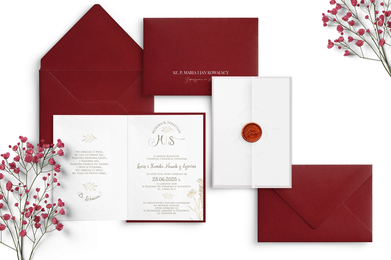 Zaproszenia ślubne Fiori - Składane z bordową kopertą i podklejką oraz lakiem