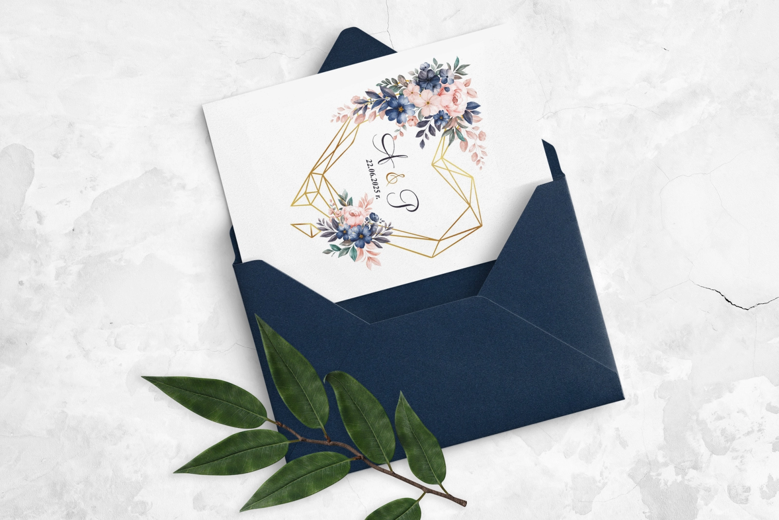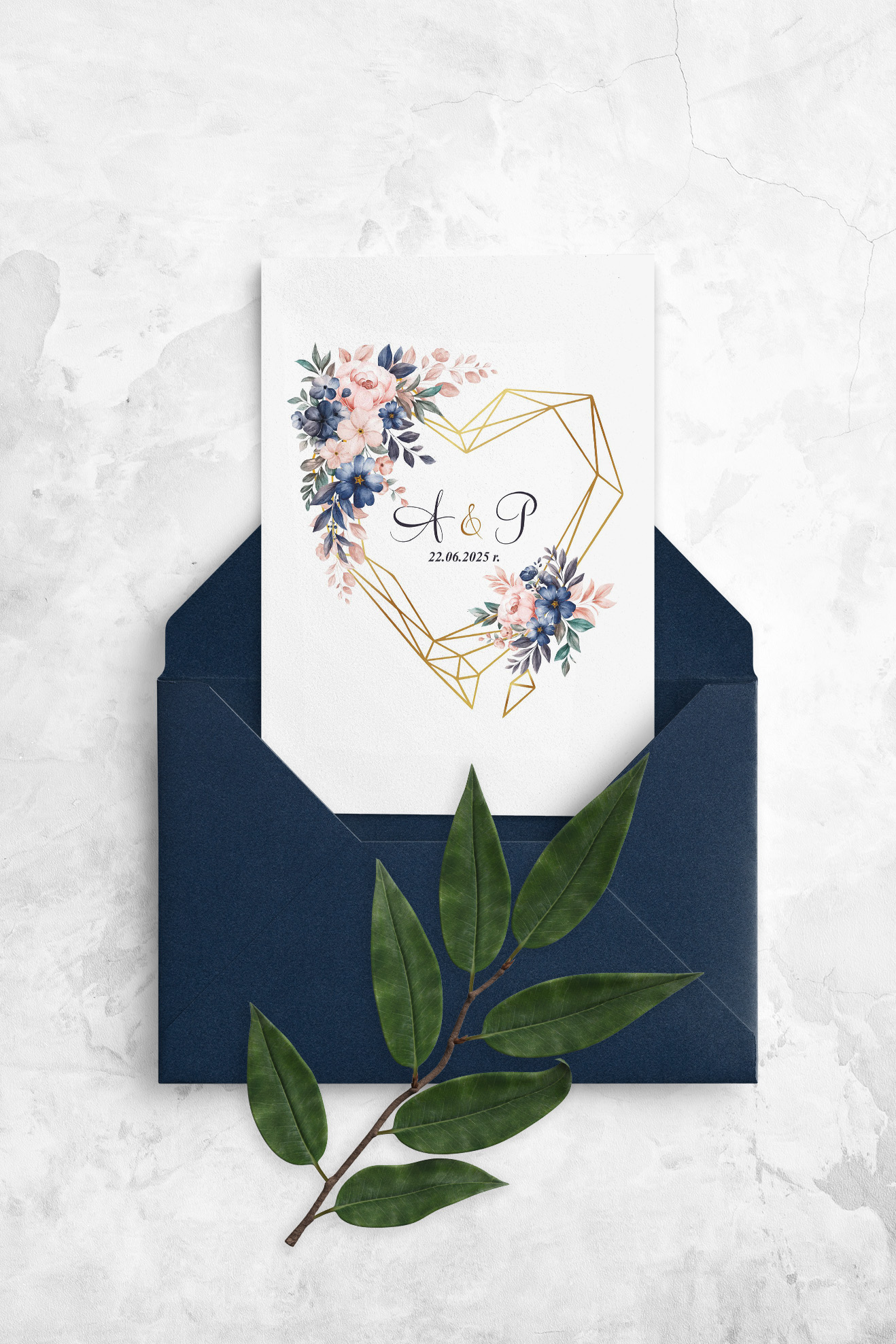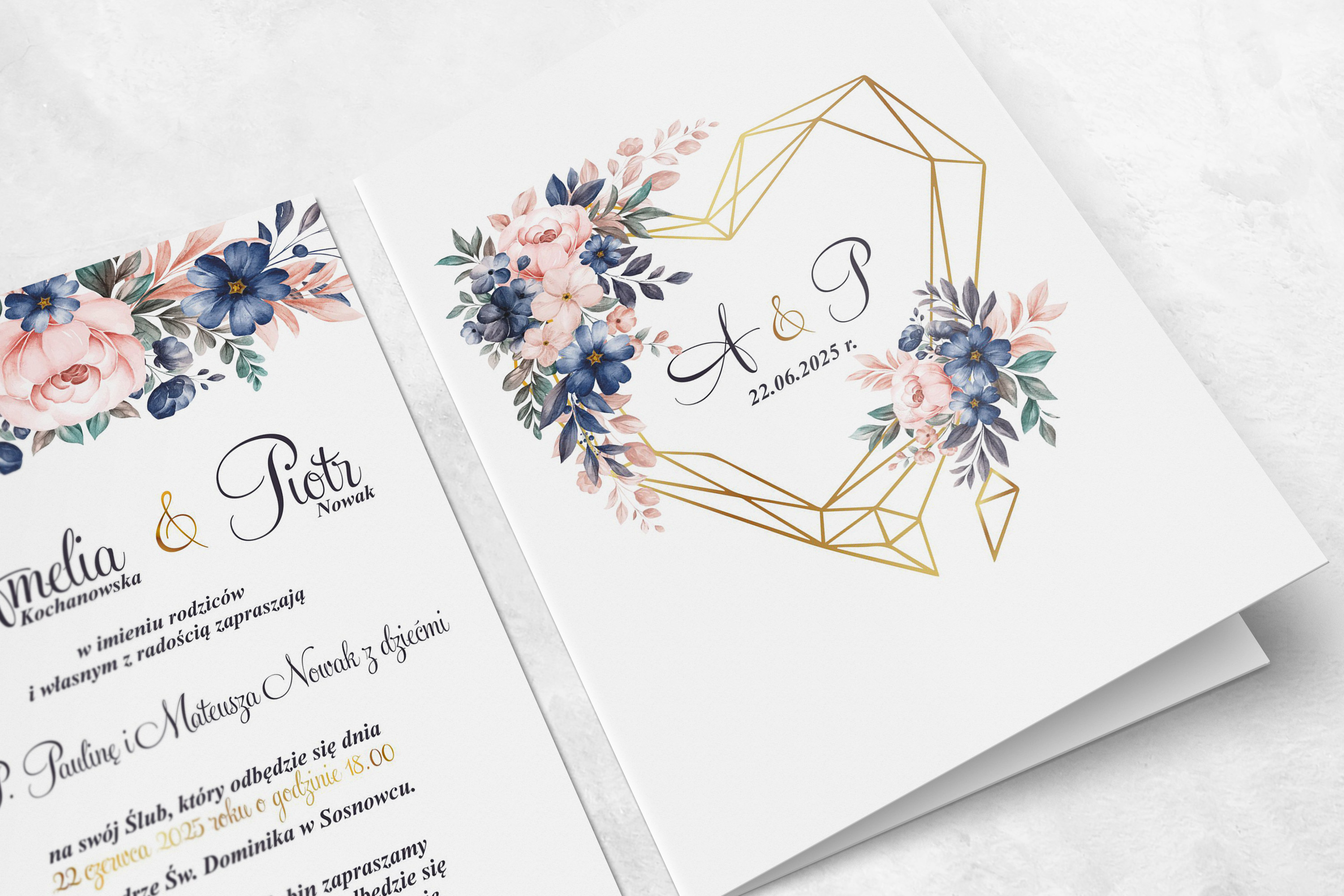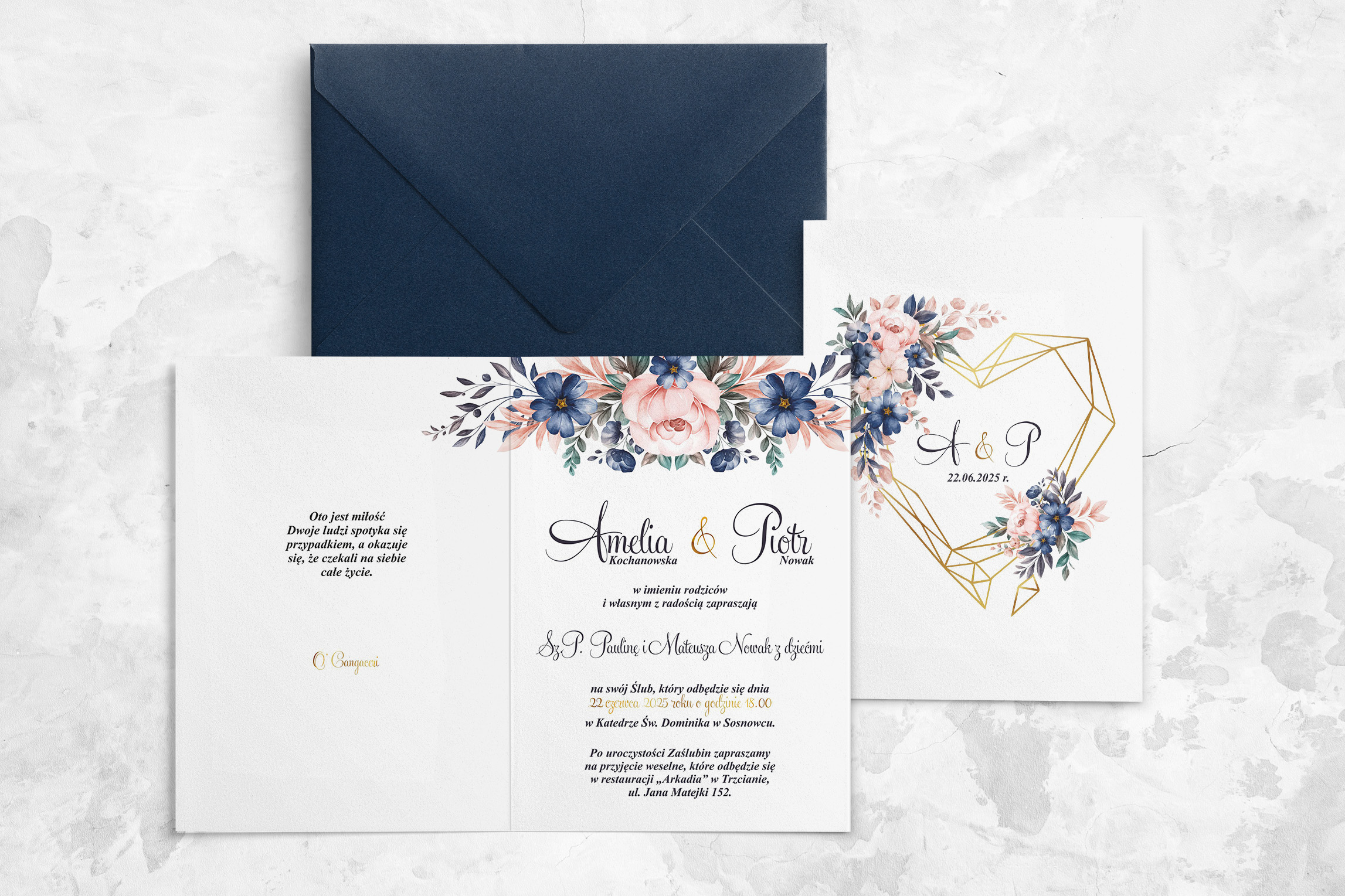 Połączenie koloru złota z delikatnymi, pastelowymi odcieniami kwiatów znakomicie stworzy spójną całość dekoracji wesela. Geometryczne serce w zaproszeniach jest nowoczesnym elementem zdobiącym, w połączeniu ze złotem dodaje szyku i elegancji.
