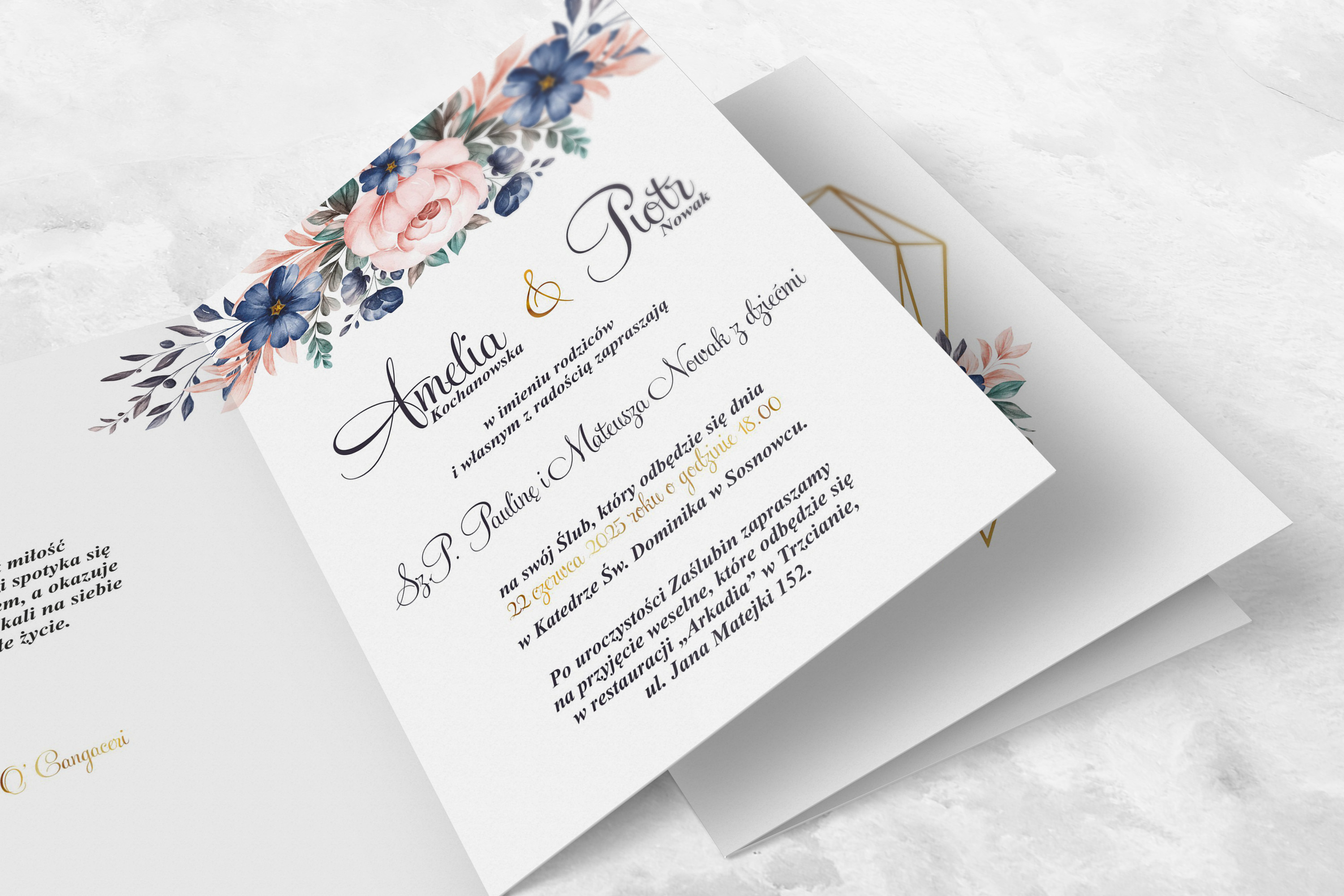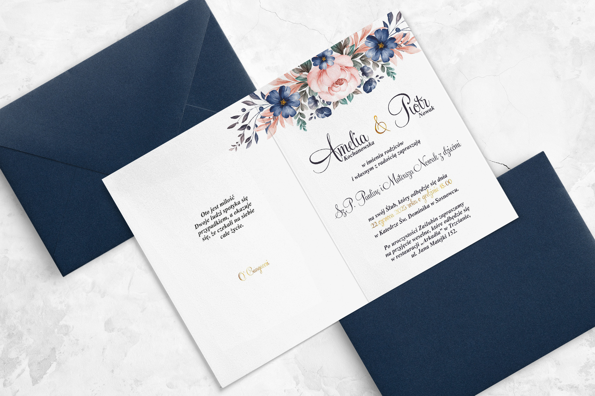Wszystkie treści zaproszenia oraz dodatkowych wkładek są dowolnie personalizowane. Możesz zmienić każdą treść na swoim zaproszeniu. Podczas wypełniania Formularza Personalizacji opisz nam jak chcesz, aby wyglądało Twoje zaproszenie. Grafik przygotuje projekt skrojony specjalnie dla Ciebie.
