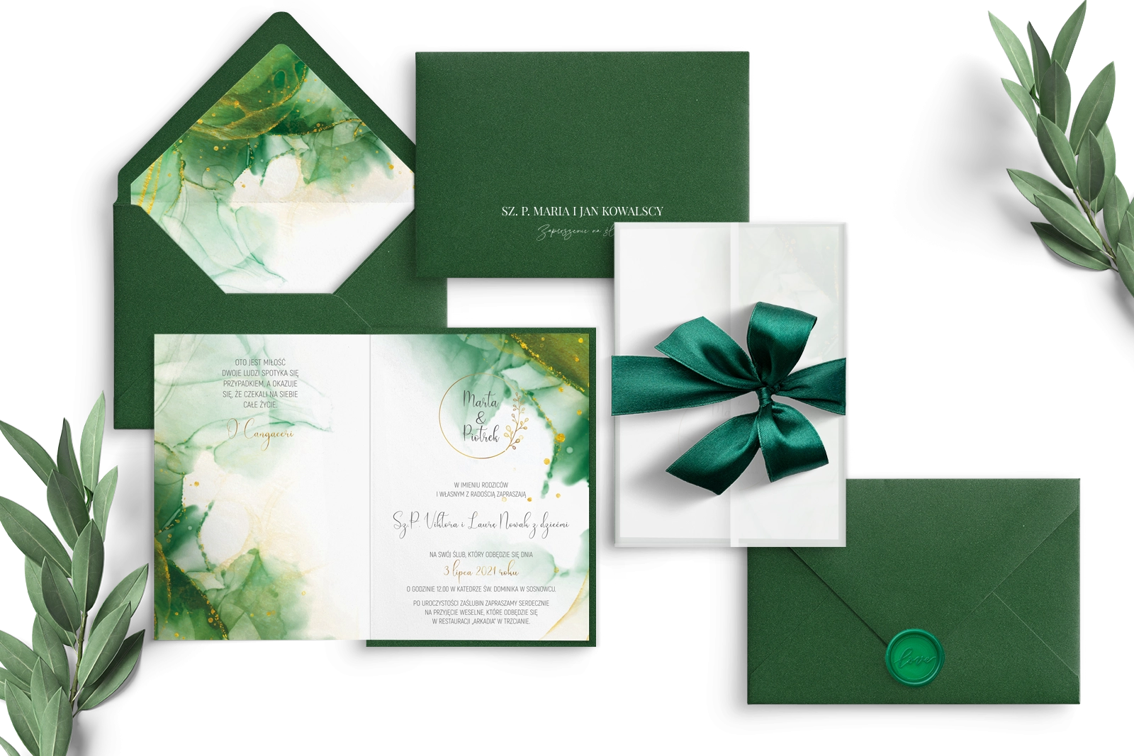 Zaproszenia ślubne Glamour Ink - Składane z butelkowo zieloną kopertą z wklejką, butelkowo zielona podklejką oraz ze wstążką