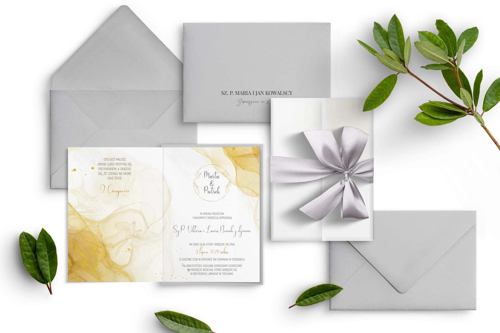 Zaproszenia ślubne Glamour Ink składane z dodatkami szarymi oraz kalką