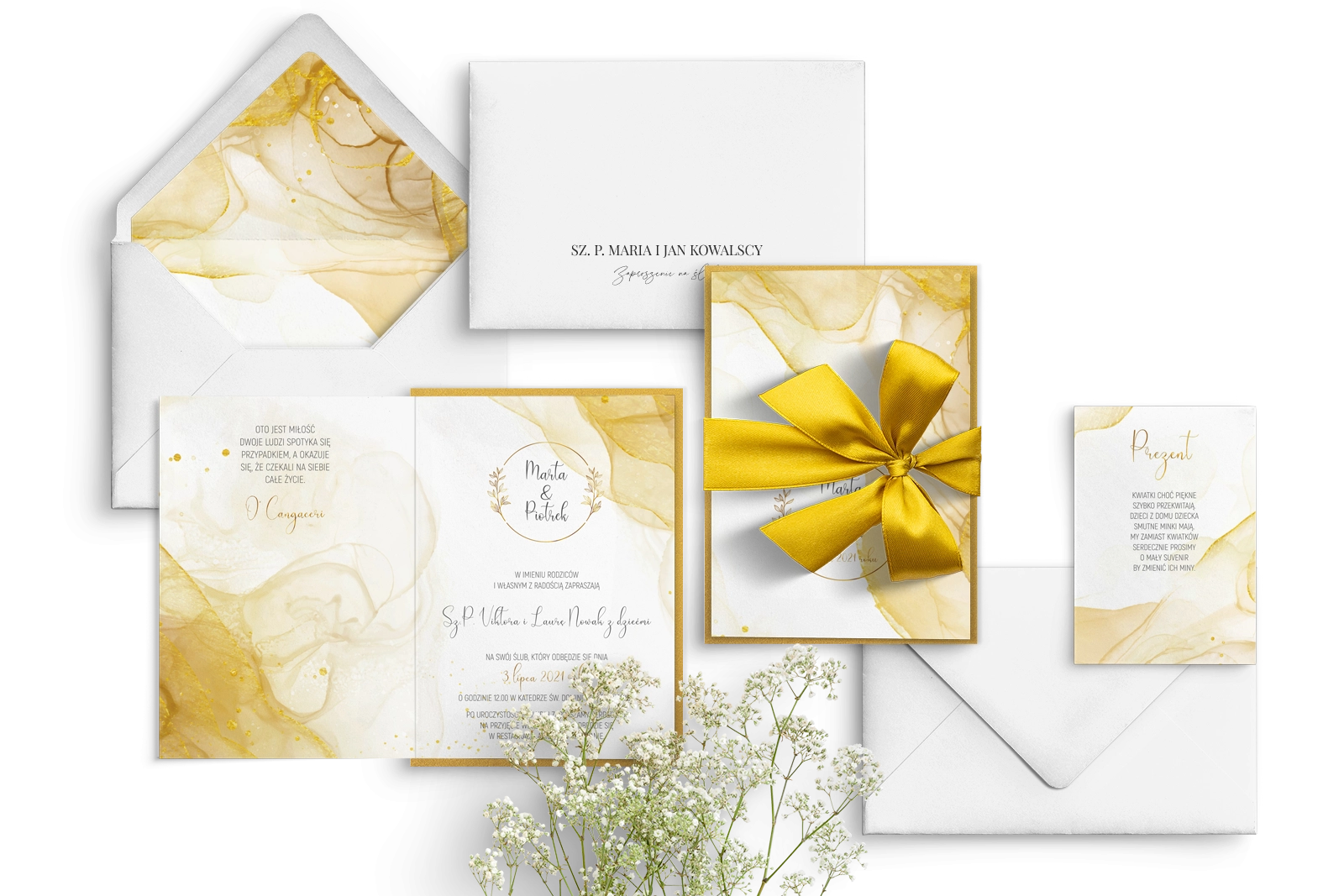 Zaproszenia ślubne Glamour Ink Składane złote z białą kopertą oraz złotą wstążką