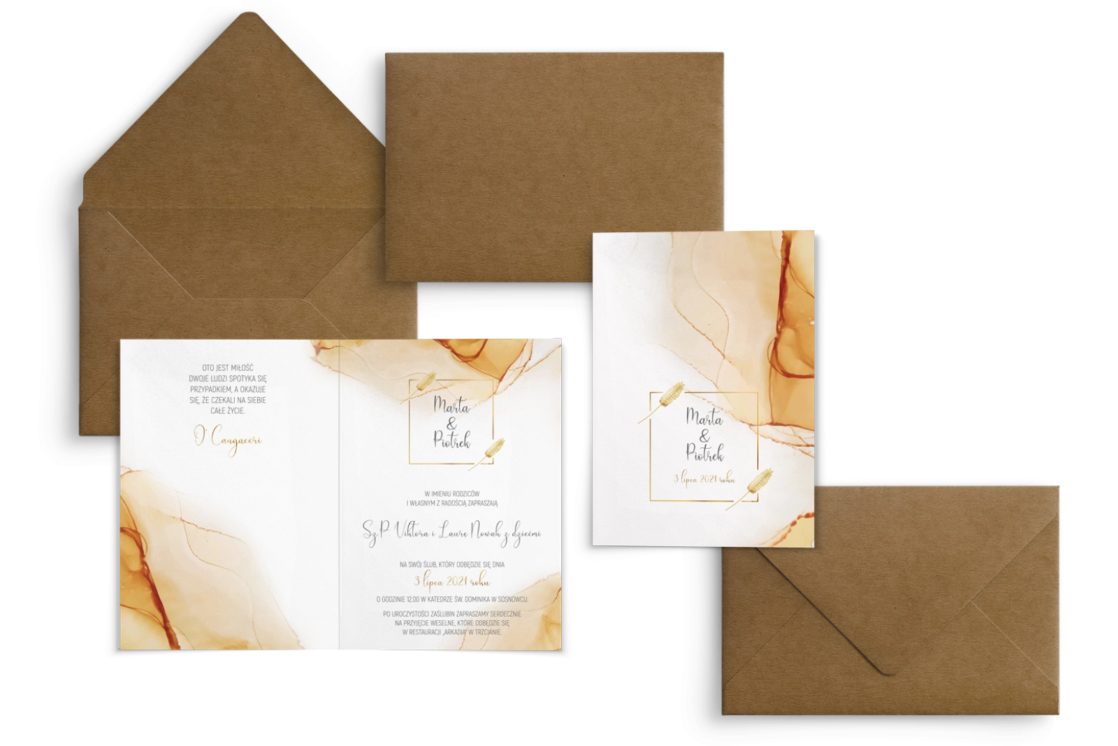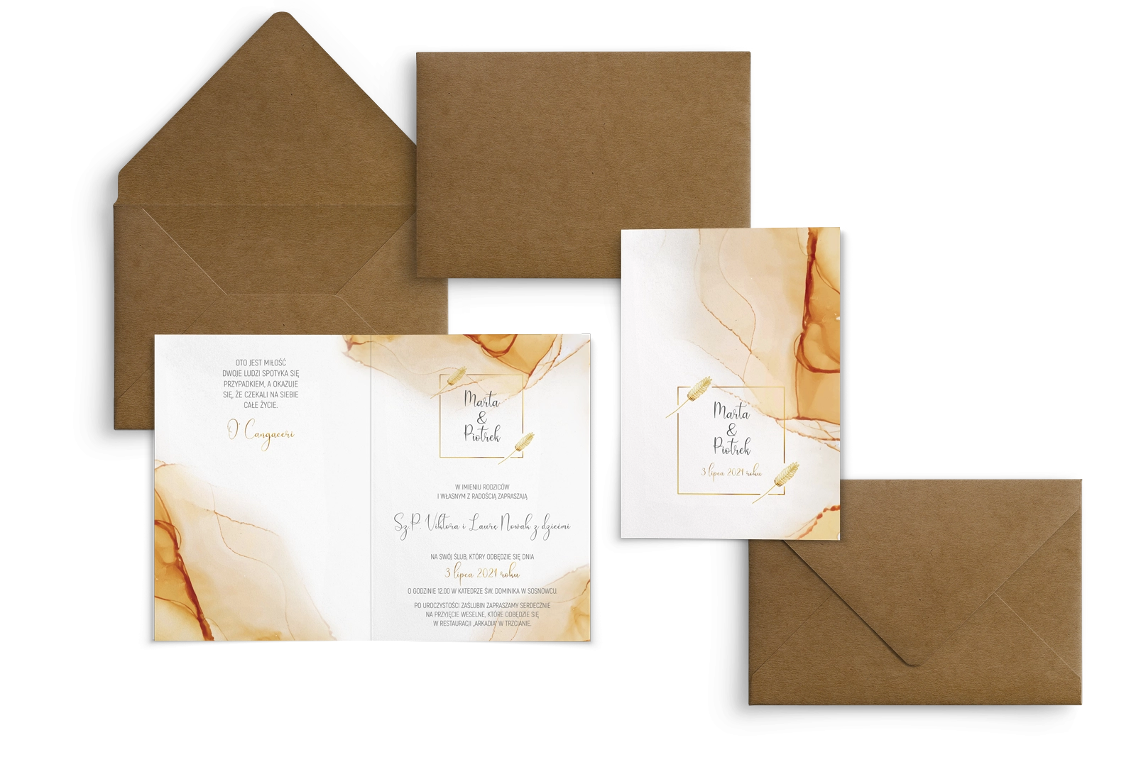 Wszystkie treści zaproszenia oraz dodatkowych wkładek są dowolnie personalizowane. Możesz zmienić każdą treść na swoim zaproszeniu. Podczas wypełniania Formularza Personalizacji opisz nam jak chcesz, aby wyglądało Twoje zaproszenie. Grafik przygotuje projekt skrojony specjalnie dla Ciebie.