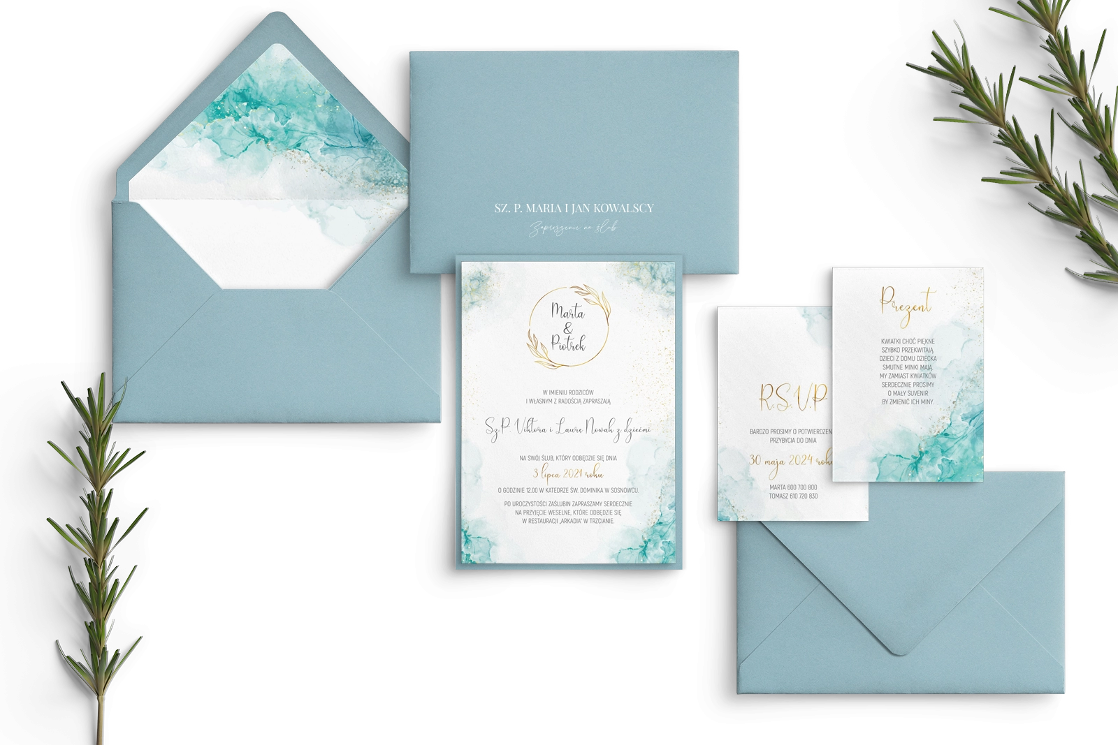 Zaproszenia ślubne Glamour Ink z błękitną kopertą i podklejką oraz z dodatkowymi wkładkami