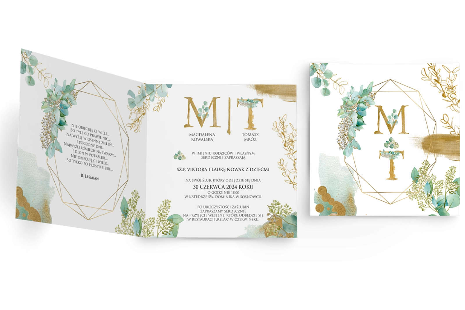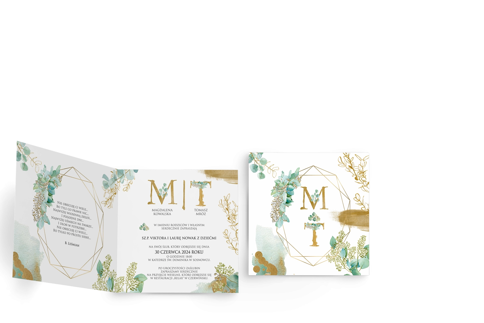 Zaproszenia ślubne Golden Green - Składane Kwadrat Motyw 1