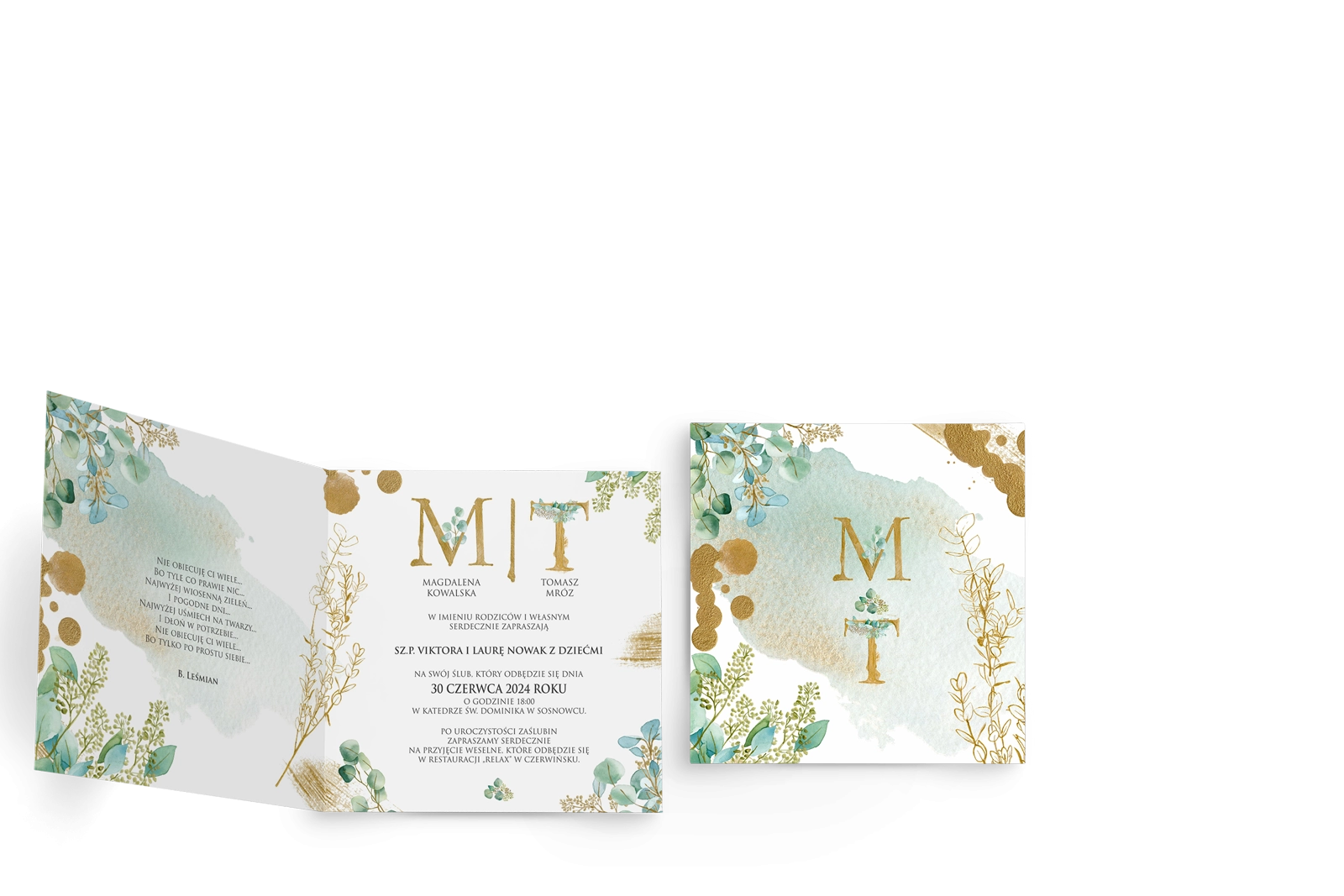 Zaproszenia ślubne Golden Green - Składane Kwadrat Motyw 3