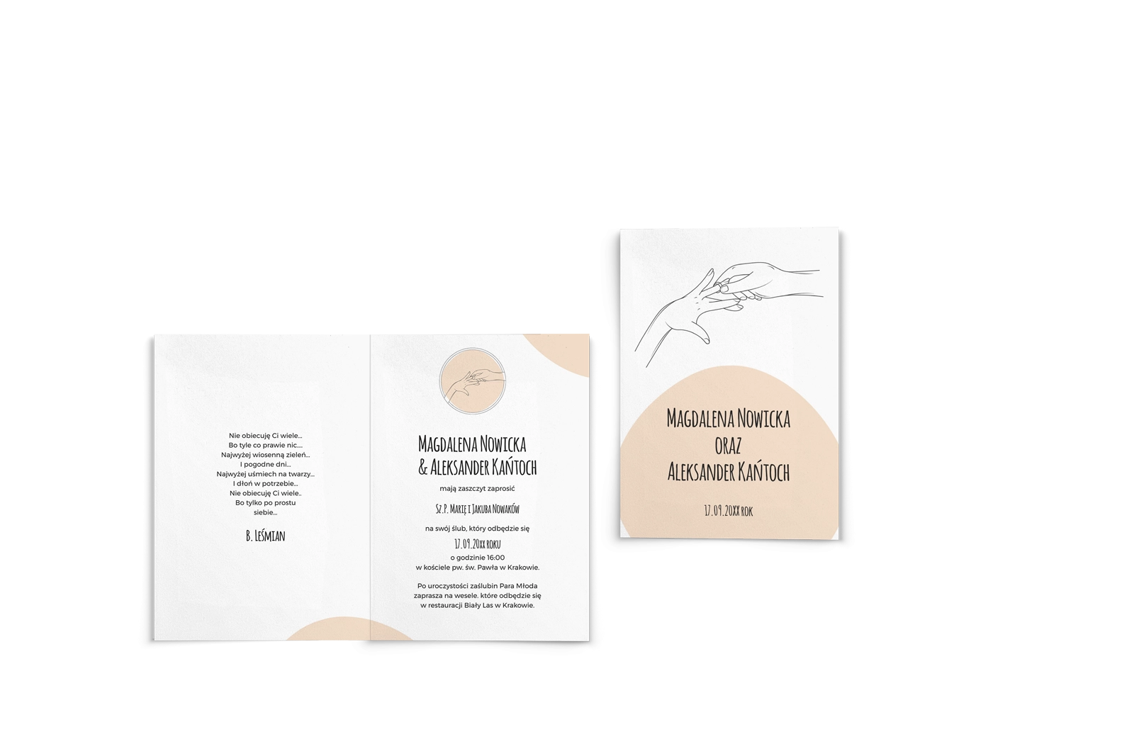 Wszystkie treści zaproszenia oraz dodatkowych wkładek są dowolnie personalizowane. Możesz zmienić każdą treść na swoim zaproszeniu. Podczas wypełniania Formularza Personalizacji opisz nam jak chcesz, aby wyglądało Twoje zaproszenie. Grafik przygotuje projekt skrojony specjalnie dla Ciebie.
