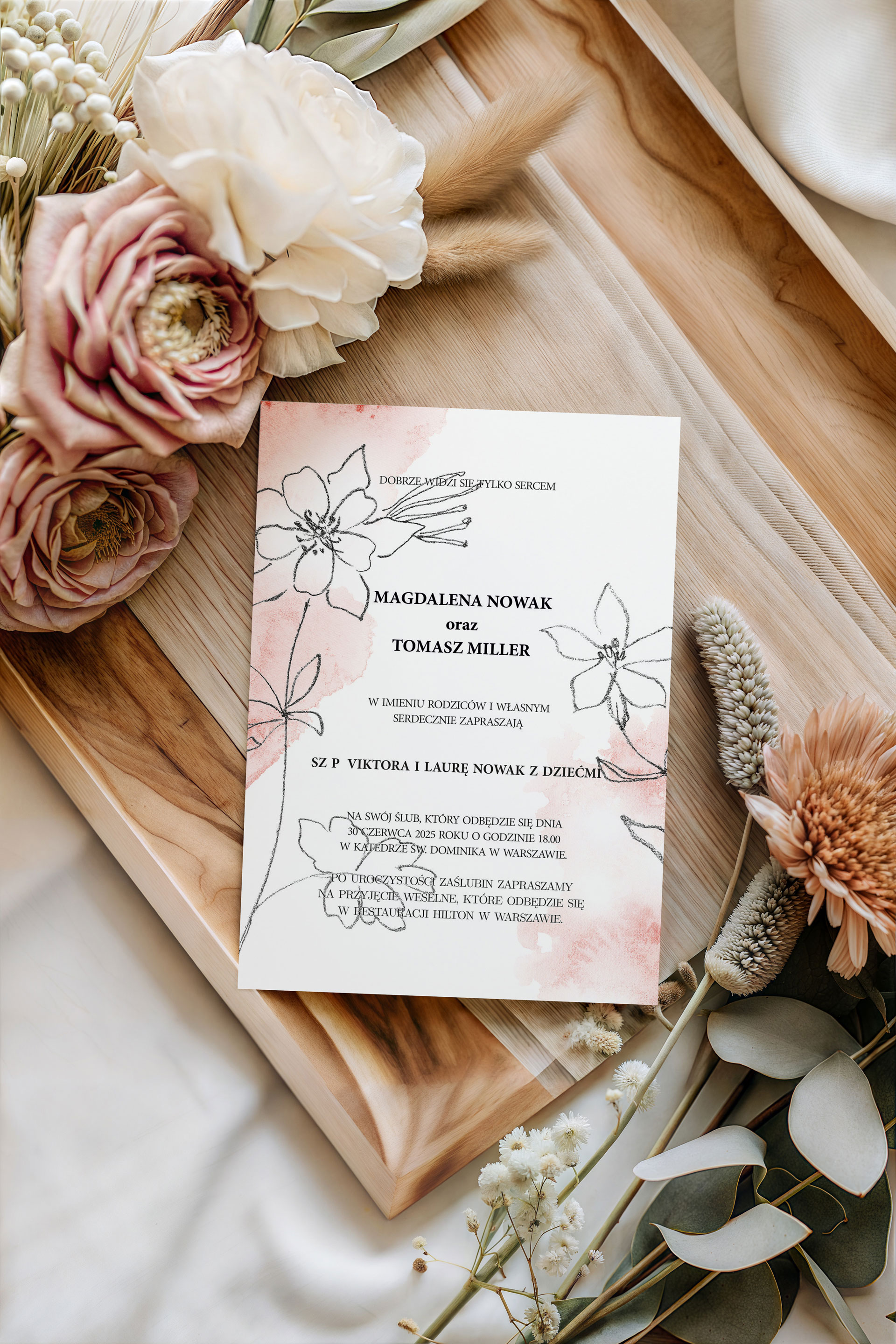 Akwarelowe zaproszenia zdobione przez imitację rozlanej farby w stonowanej kolorystyce różu. Głównym zdobieniem tego zaproszenia jest szkicowany kwiat w ciemnej kolorystyce. Całość tworzy bardzo nowoczesne z zarazem eleganckie zaproszenie. Kombinacja ta jest alternatywą dla zaproszeń o wielobarwnych kwiatach.