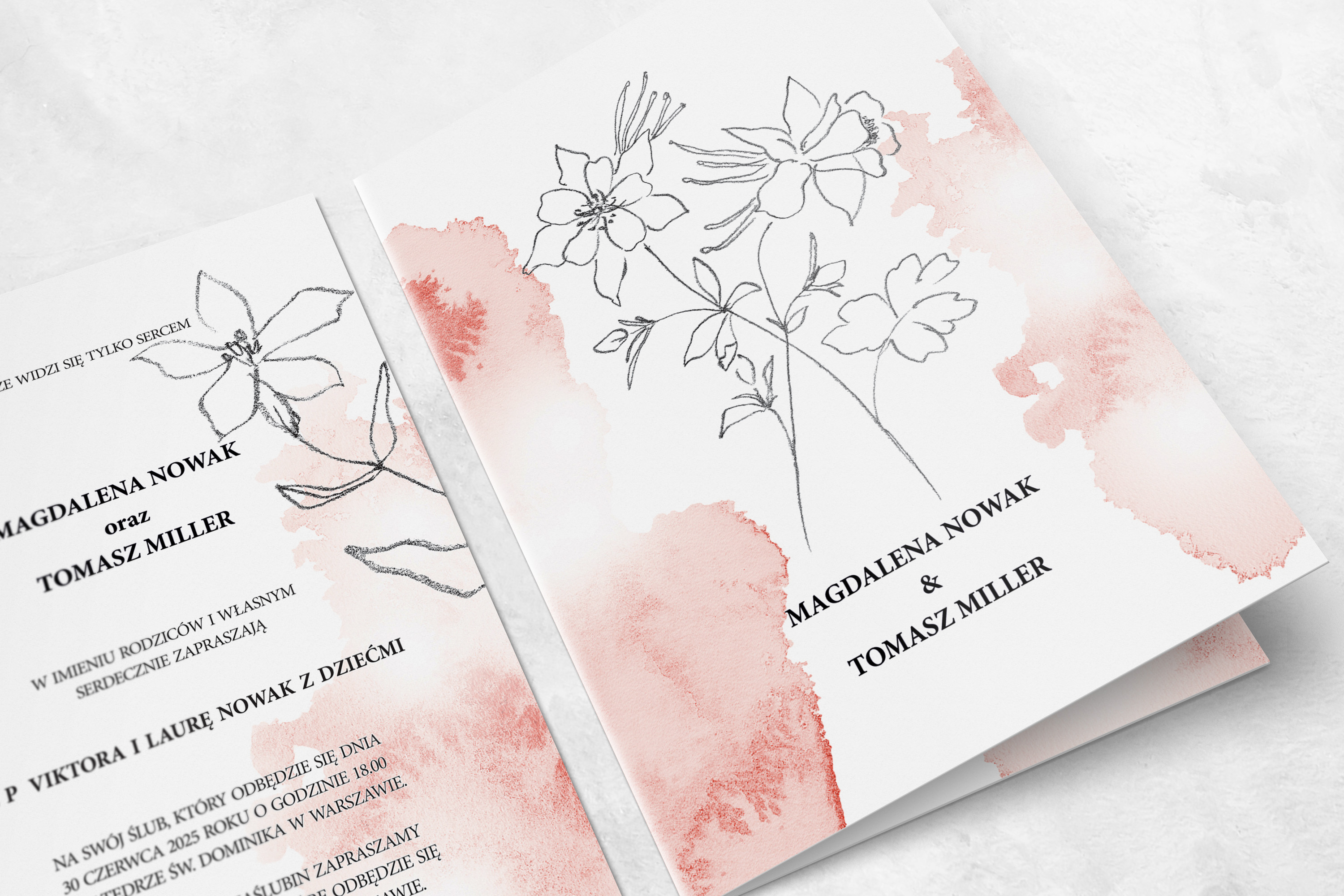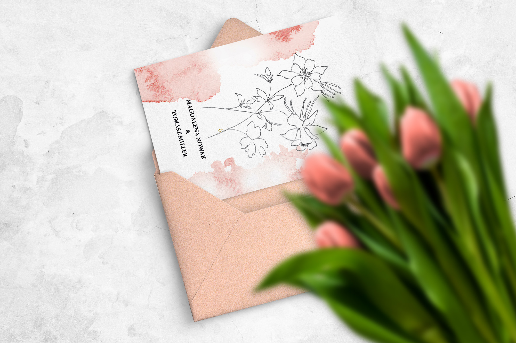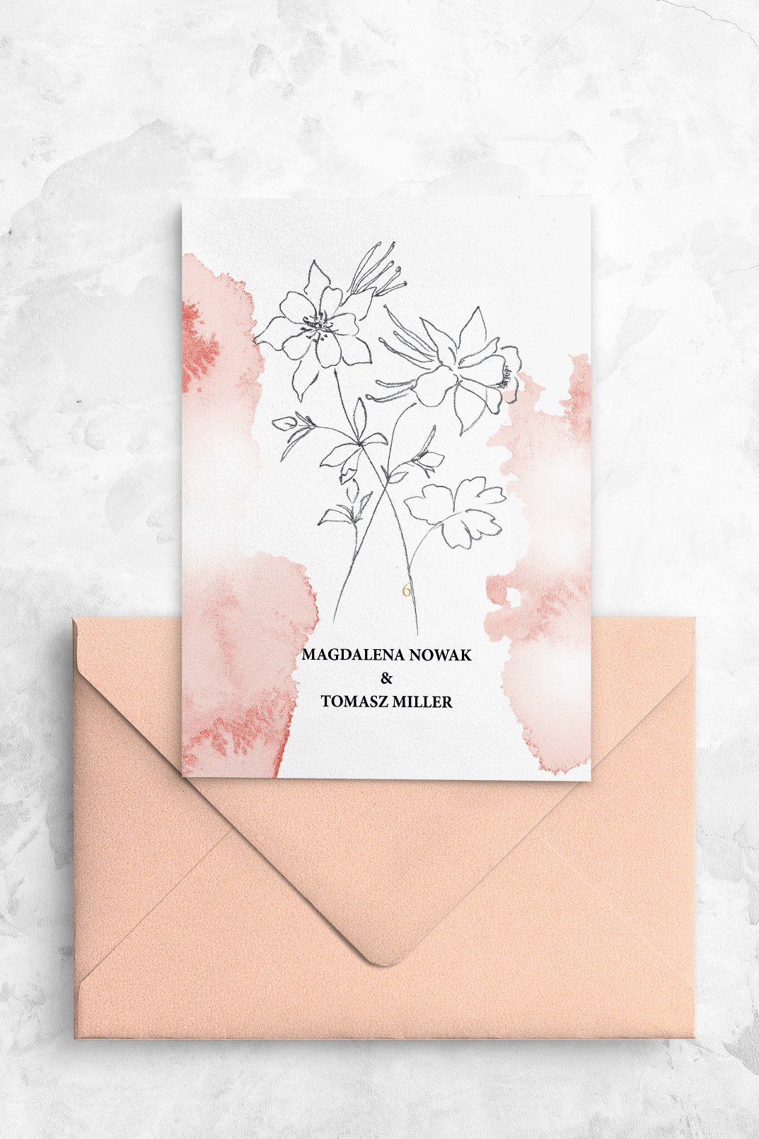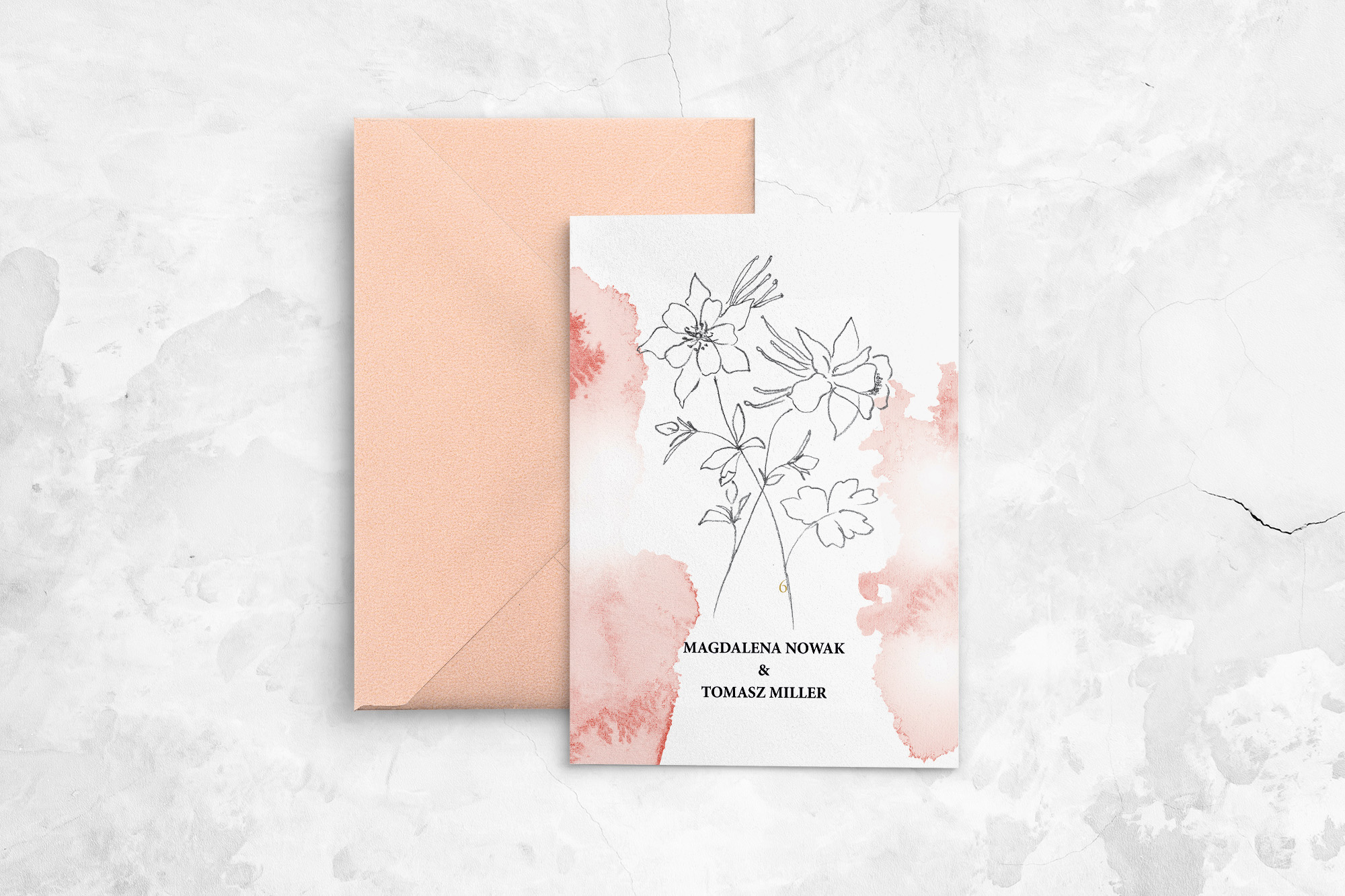 Akwarelowe zaproszenia zdobione przez imitację rozlanej farby w stonowanej kolorystyce różu. Głównym zdobieniem tego zaproszenia jest szkicowany kwiat w ciemnej kolorystyce. Całość tworzy bardzo nowoczesne z zarazem eleganckie zaproszenie. Kombinacja ta jest alternatywą dla zaproszeń o wielobarwnych kwiatach.