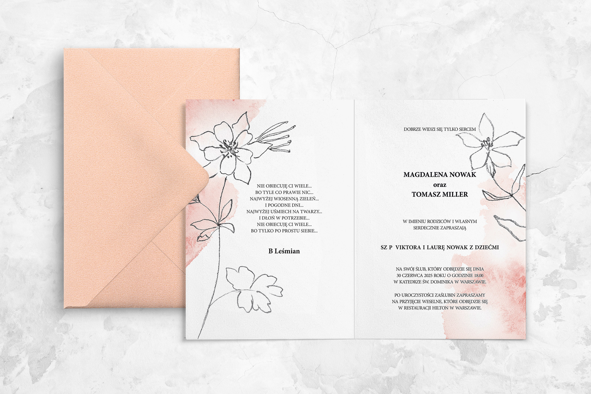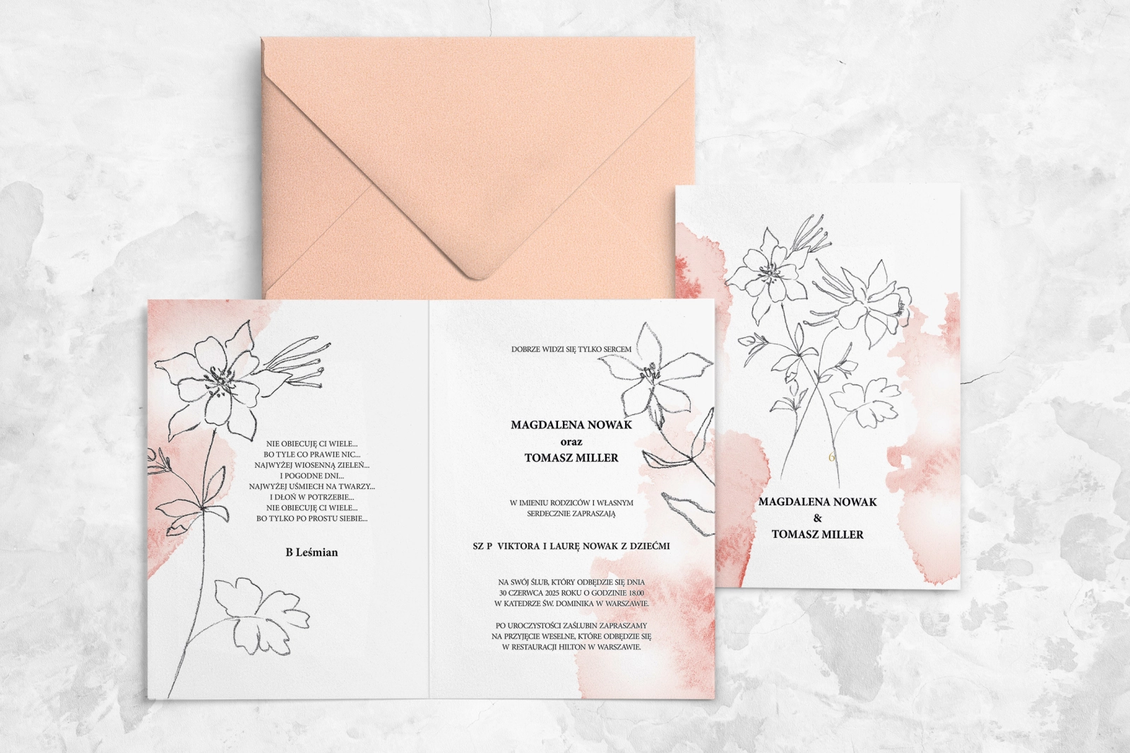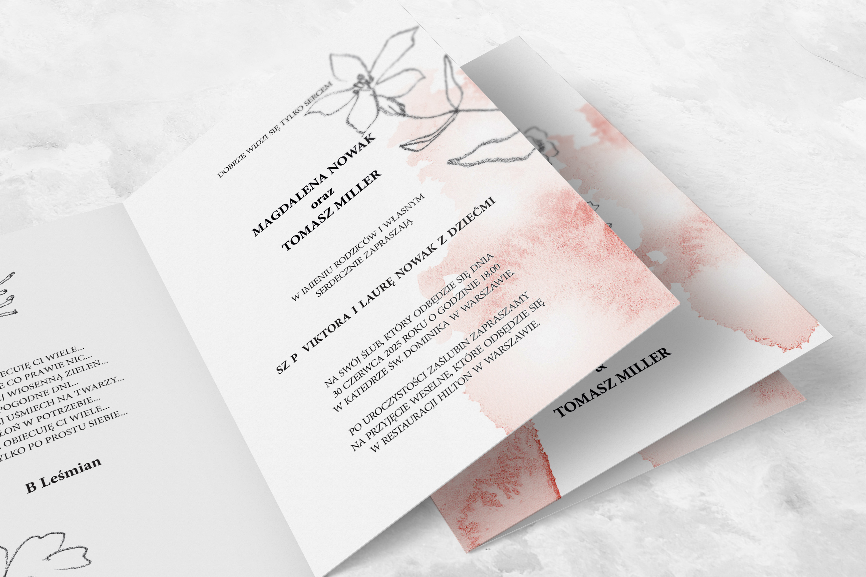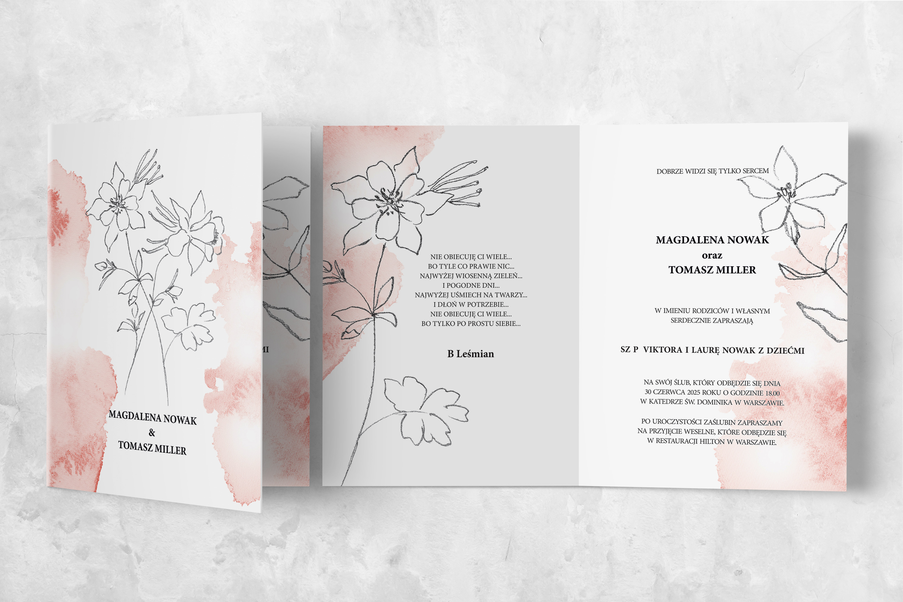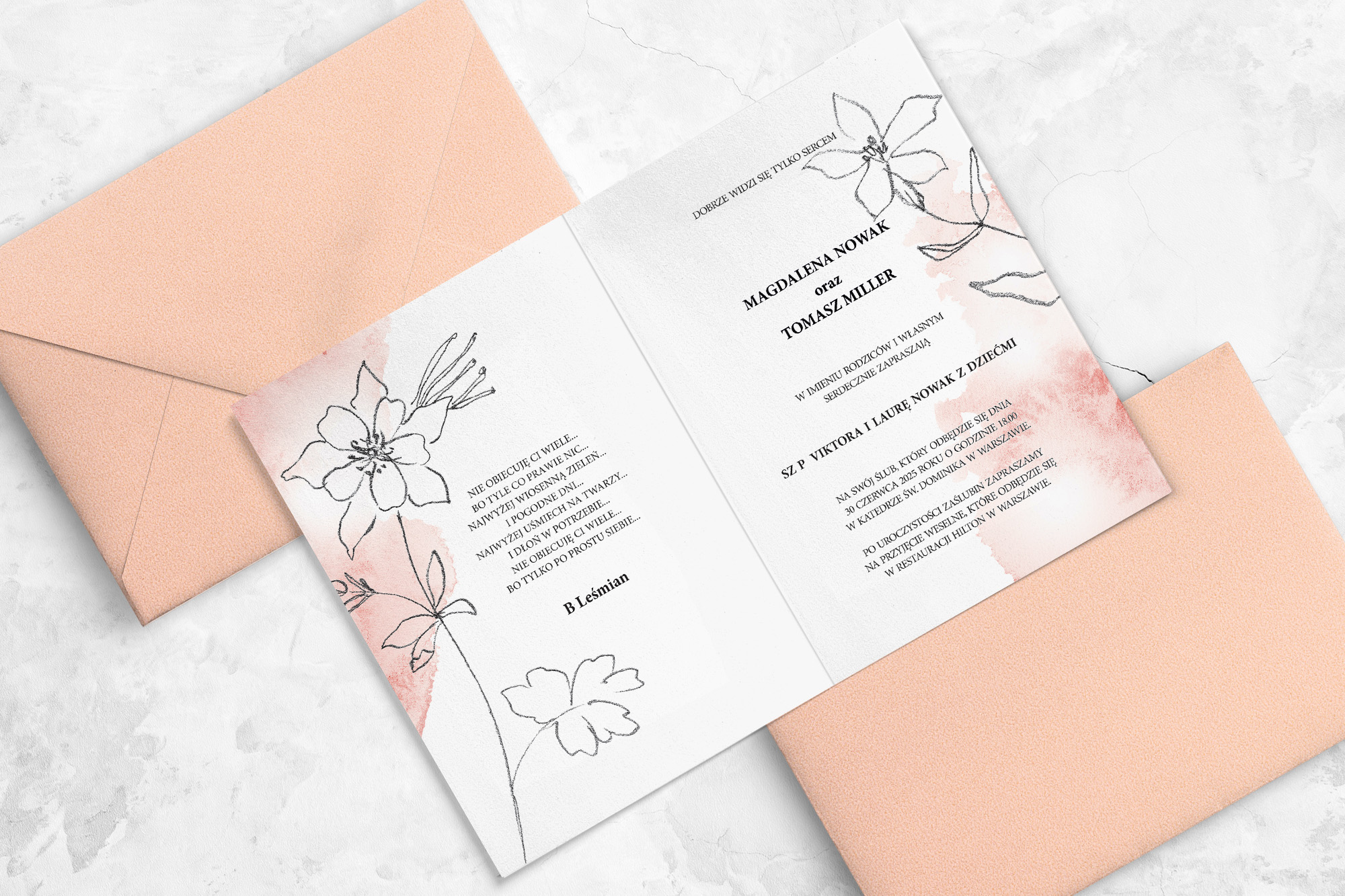 Akwarelowe zaproszenia zdobione przez imitację rozlanej farby w stonowanej kolorystyce różu. Głównym zdobieniem tego zaproszenia jest szkicowany kwiat w ciemnej kolorystyce. Całość tworzy bardzo nowoczesne z zarazem eleganckie zaproszenie. Kombinacja ta jest alternatywą dla zaproszeń o wielobarwnych kwiatach.