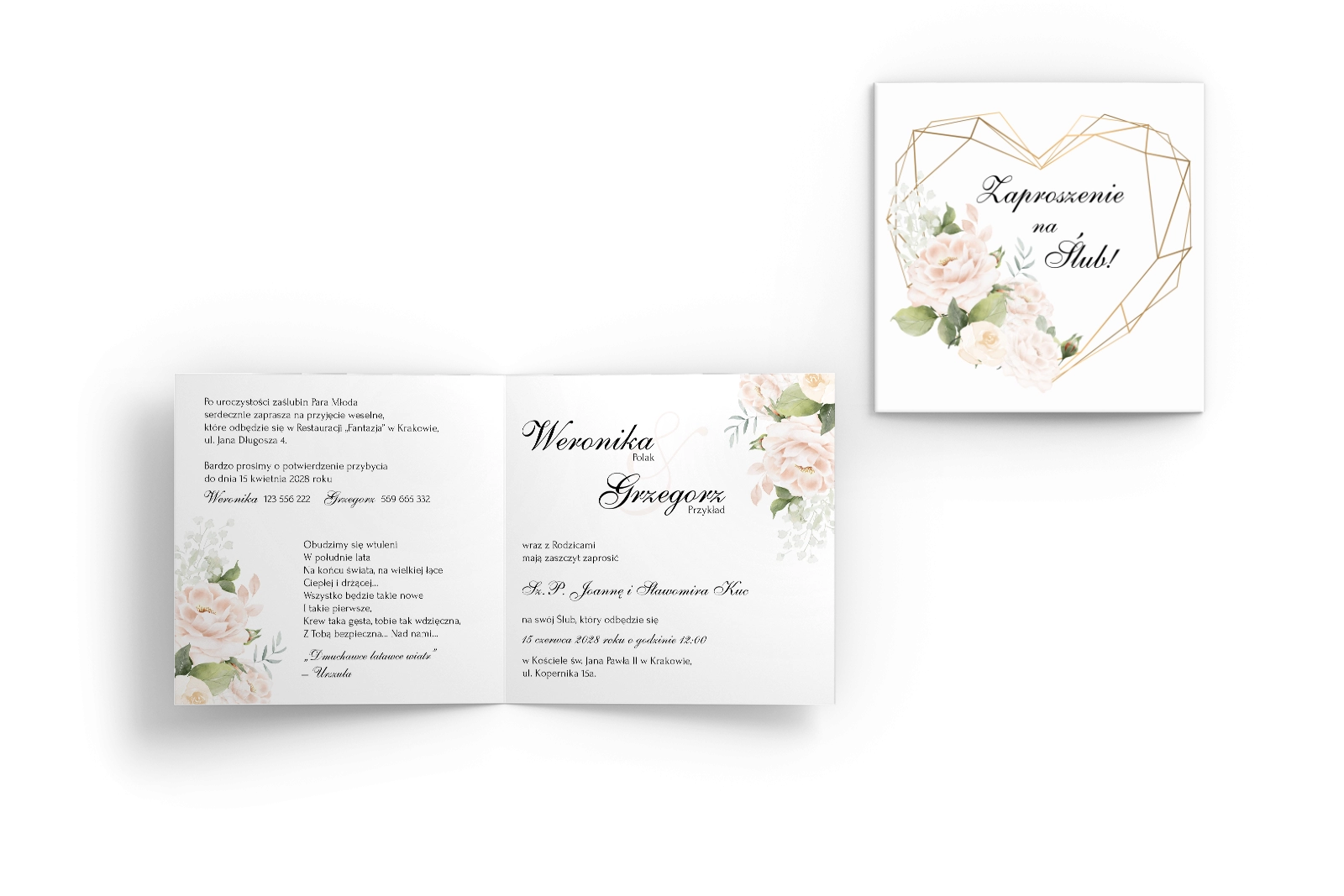 Na tej karcie produktu kupujesz Zaproszenia Ślubne Składane Kwadratowe w konfiguracji określonej w specyfikacji. Nasze zaproszenia ślubne są drukowane na wybranym przez Ciebie papierze przy użyciu wysokiej jakości drukarki produkcyjnej, która zapewnia mocne, nasycone kolory oraz czytelny wyrazisty tekst.