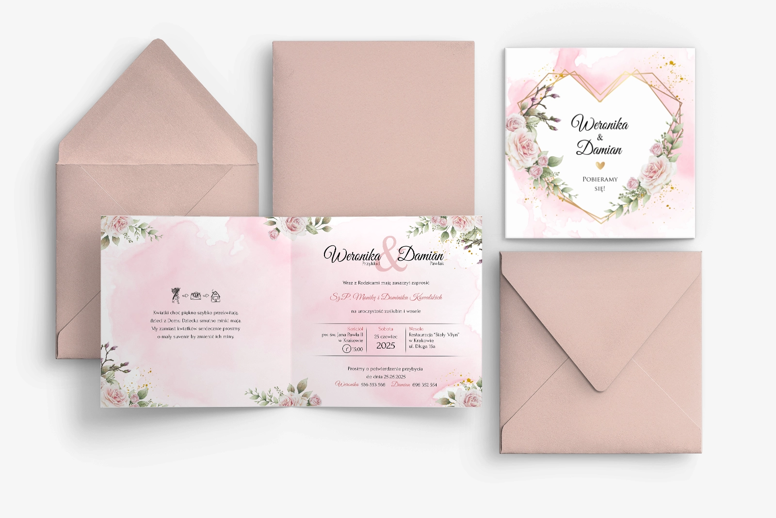Wszystkie treści zaproszenia oraz dodatkowych wkładek są dowolnie personalizowane. Możesz zmienić każdą treść na swoim zaproszeniu. Podczas wypełniania Formularza Personalizacji opisz nam jak chcesz, aby wyglądało Twoje zaproszenie. Grafik przygotuje projekt skrojony specjalnie dla Ciebie.