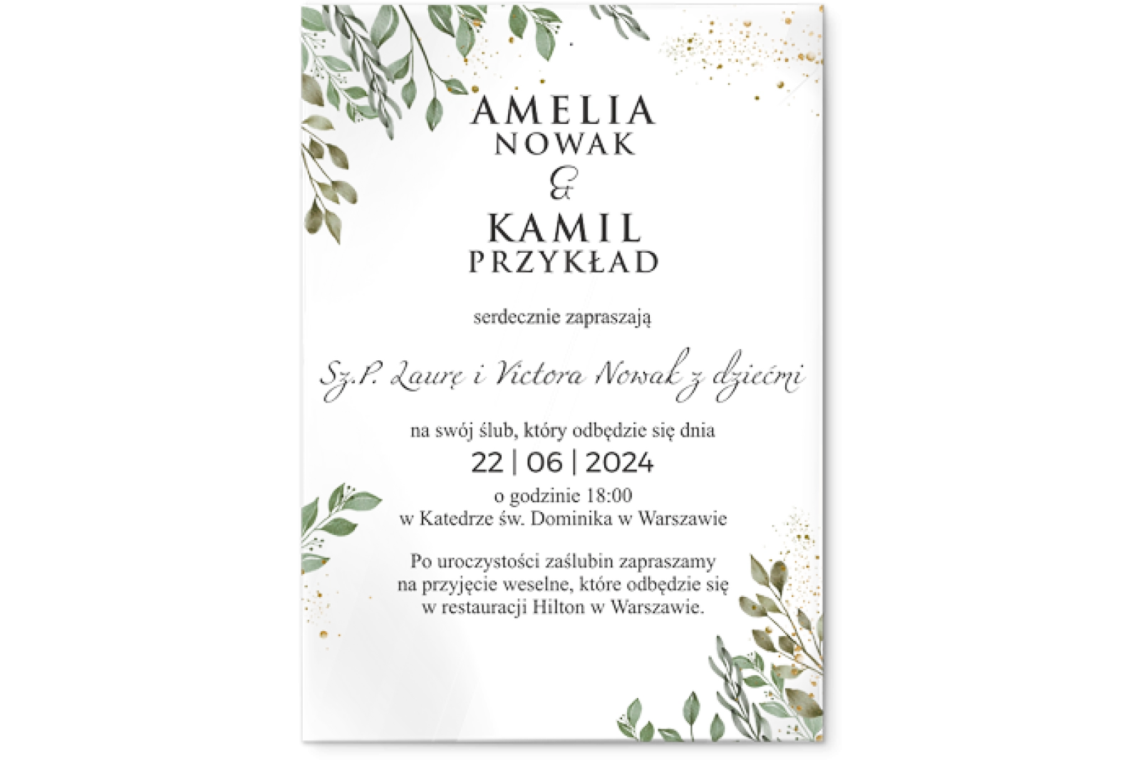 Wszystkie treści zaproszenia oraz dodatkowych wkładek są dowolnie personalizowane. Możesz zmienić każdą treść na swoim zaproszeniu. Podczas wypełniania Formularza Personalizacji opisz nam jak chcesz, aby wyglądało Twoje zaproszenie. Grafik przygotuje projekt skrojony specjalnie dla Ciebie.