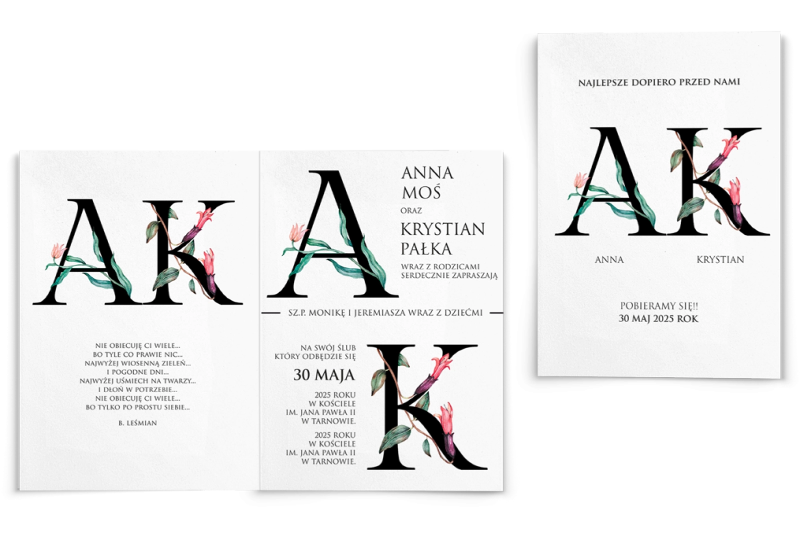 Wszystkie treści zaproszenia oraz dodatkowych wkładek są dowolnie personalizowane. Możesz zmienić każdą treść na swoim zaproszeniu. Podczas wypełniania Formularza Personalizacji opisz nam jak chcesz, aby wyglądało Twoje zaproszenie. Grafik przygotuje projekt skrojony specjalnie dla Ciebie.