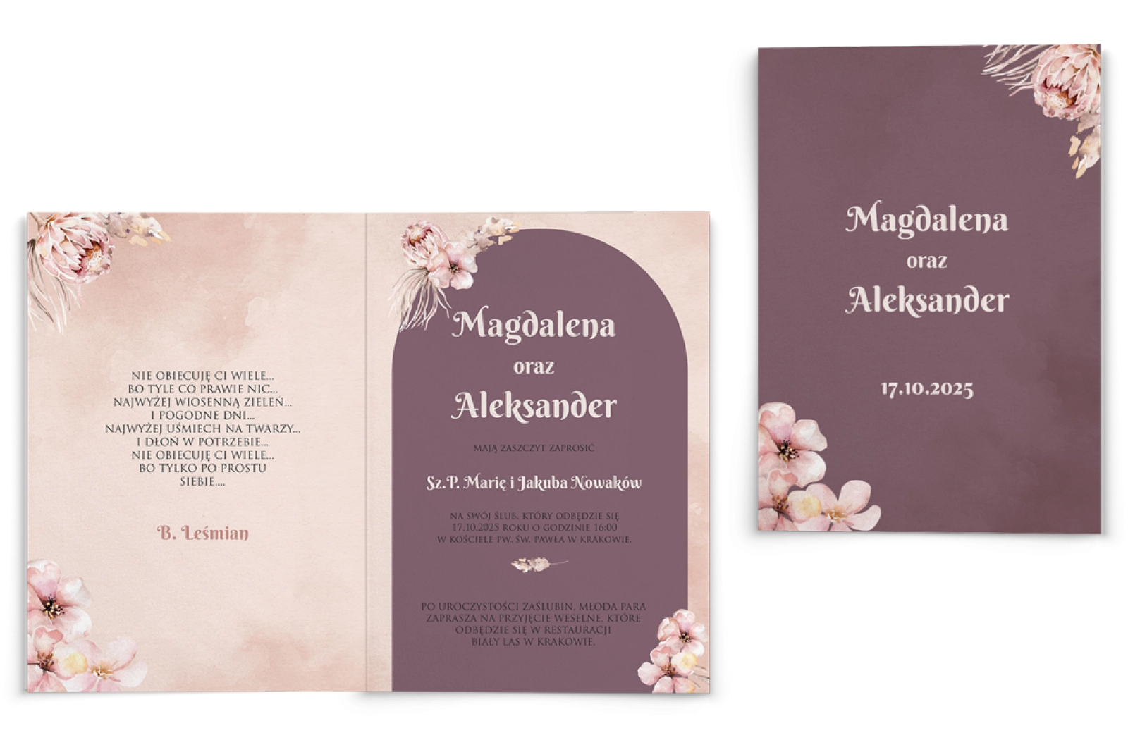 Wszystkie treści zaproszenia oraz dodatkowych wkładek są dowolnie personalizowane. Możesz zmienić każdą treść na swoim zaproszeniu. Podczas wypełniania Formularza Personalizacji opisz nam jak chcesz, aby wyglądało Twoje zaproszenie. Grafik przygotuje projekt skrojony specjalnie dla Ciebie.
