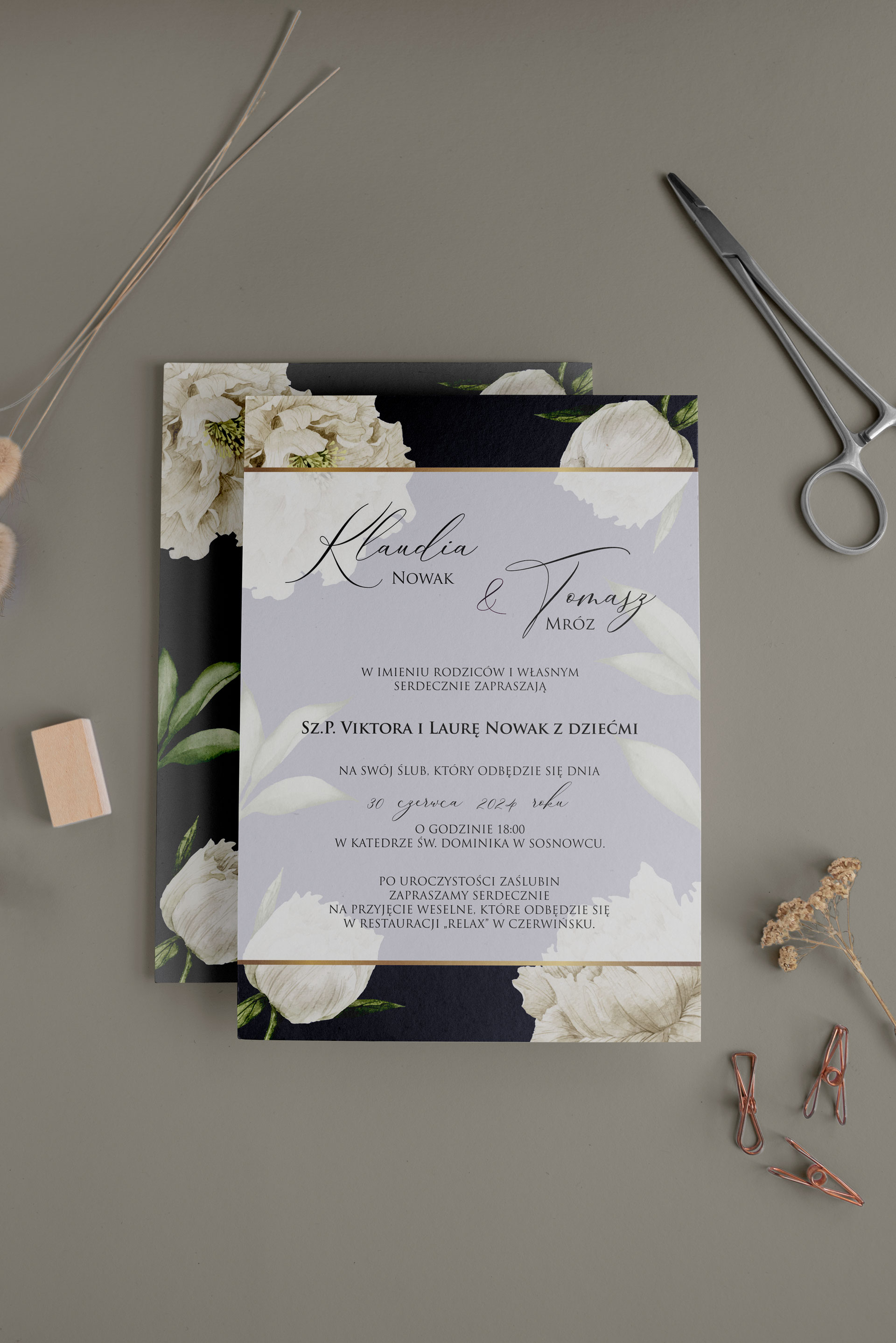 Eleganckie zaproszenia ślubne w których białe piwonie otulają złotą ramkę. Tło jest ciemno granatowe. Drukowane na grubych papierach o różnych fakturach.