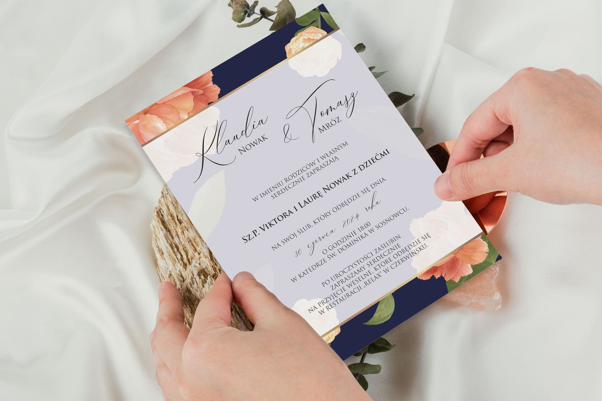 Wszystkie treści zaproszenia oraz dodatkowych wkładek są dowolnie personalizowane. Możesz zmienić każdą treść na swoim zaproszeniu. Podczas wypełniania Formularza Personalizacji opisz nam jak chcesz, aby wyglądało Twoje zaproszenie. Grafik przygotuje projekt skrojony specjalnie dla Ciebie.