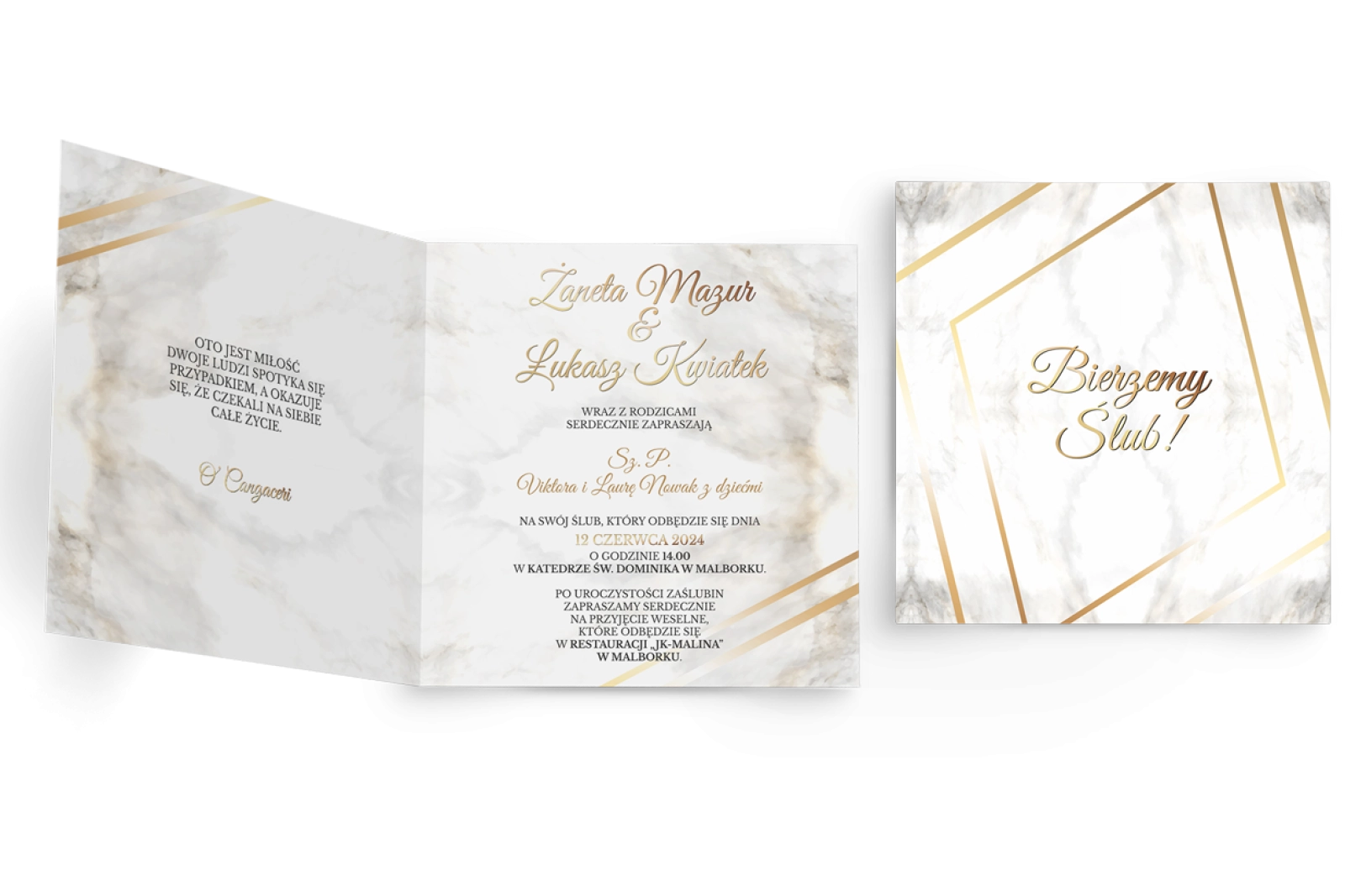 Zaproszenia ślubne Marmur & Złoto - Składane Kwadrat Motyw 1