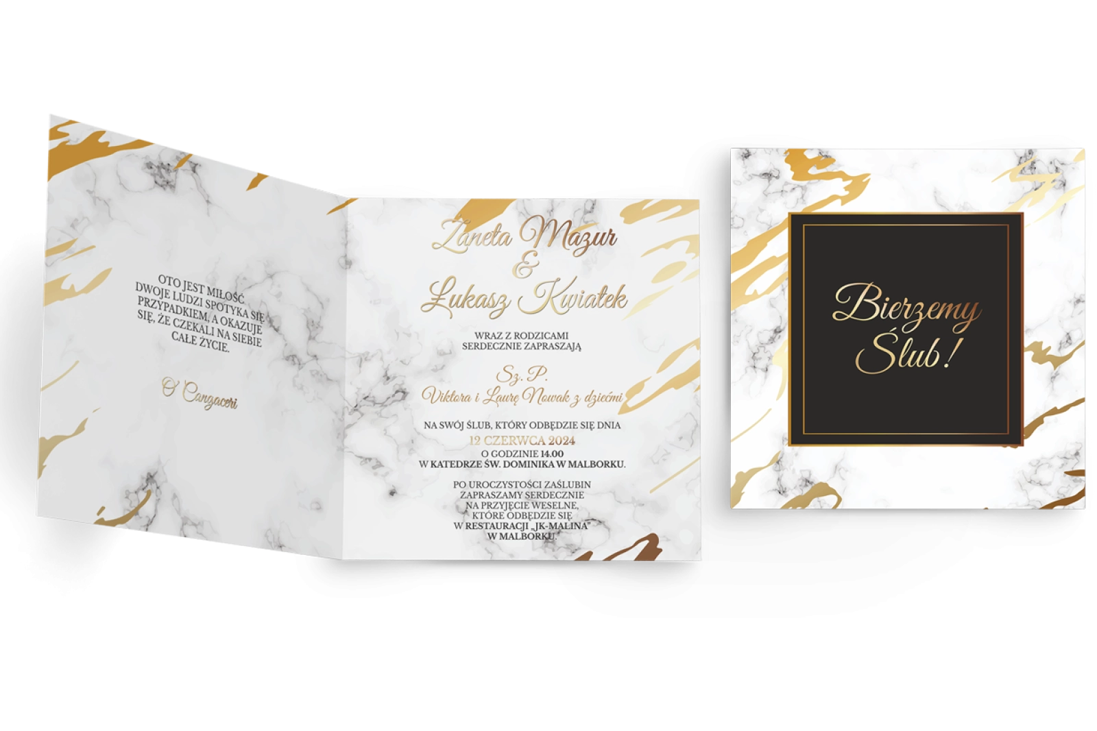 Zaproszenia ślubne Marmur & Złoto - Składane Kwadrat Motyw 3
