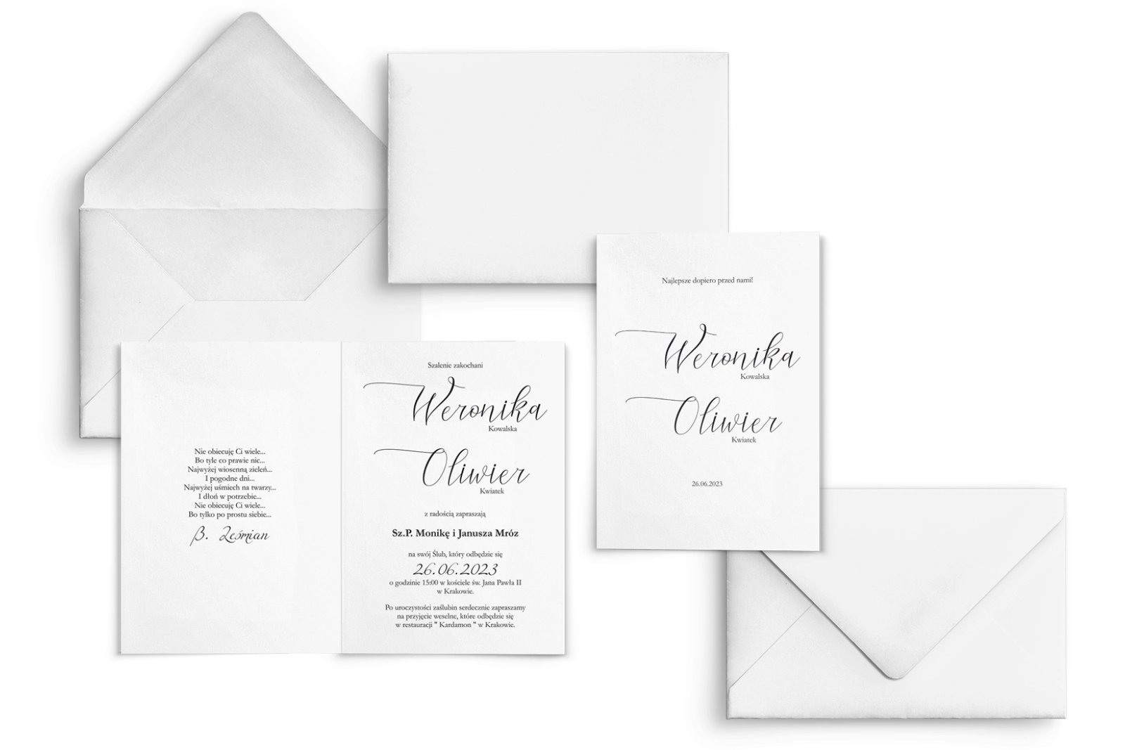 Wszystkie treści zaproszenia oraz dodatkowych wkładek są dowolnie personalizowane. Możesz zmienić każdą treść na swoim zaproszeniu. Podczas wypełniania Formularza Personalizacji opisz nam jak chcesz, aby wyglądało Twoje zaproszenie. Grafik przygotuje projekt skrojony specjalnie dla Ciebie.