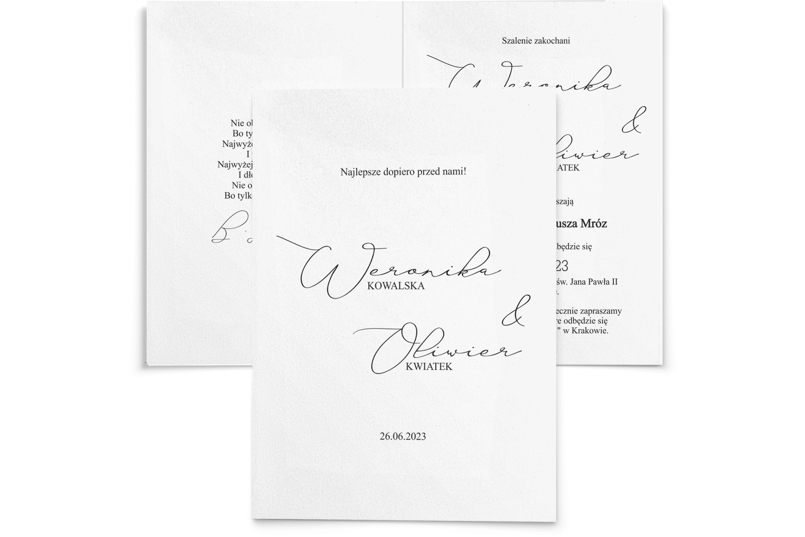 Wszystkie treści zaproszenia oraz dodatkowych wkładek są dowolnie personalizowane. Możesz zmienić każdą treść na swoim zaproszeniu. Podczas wypełniania Formularza Personalizacji opisz nam jak chcesz, aby wyglądało Twoje zaproszenie. Grafik przygotuje projekt skrojony specjalnie dla Ciebie.