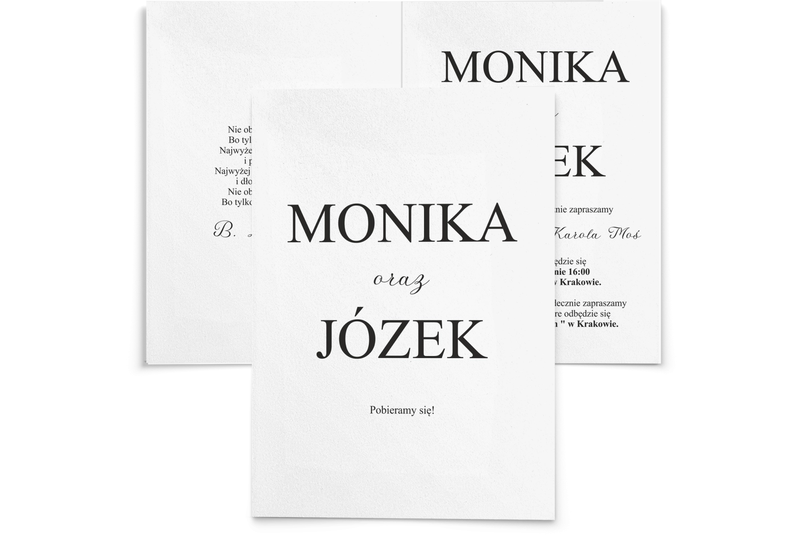 Wszystkie treści zaproszenia oraz dodatkowych wkładek są dowolnie personalizowane. Możesz zmienić każdą treść na swoim zaproszeniu. Podczas wypełniania Formularza Personalizacji opisz nam jak chcesz, aby wyglądało Twoje zaproszenie. Grafik przygotuje projekt skrojony specjalnie dla Ciebie.