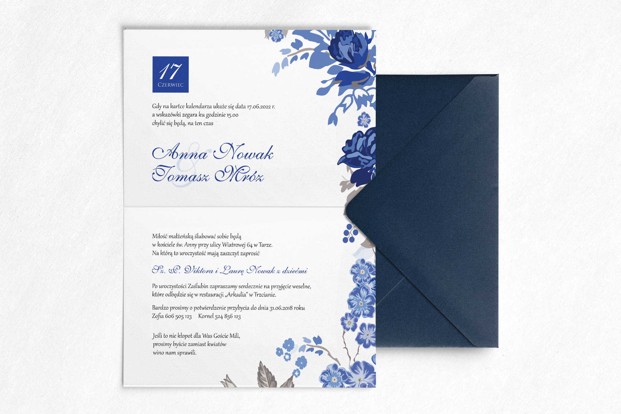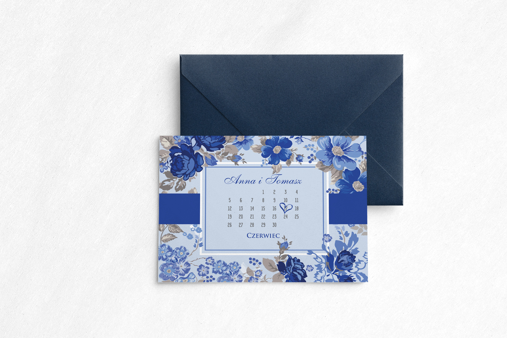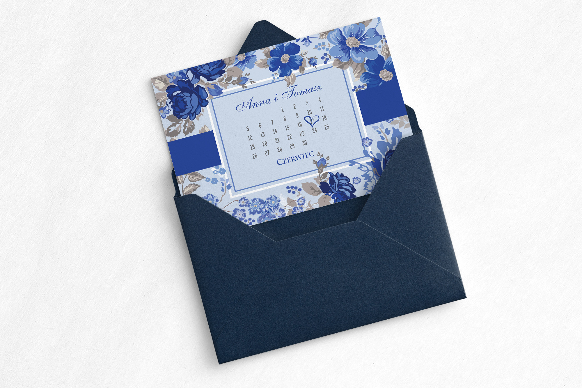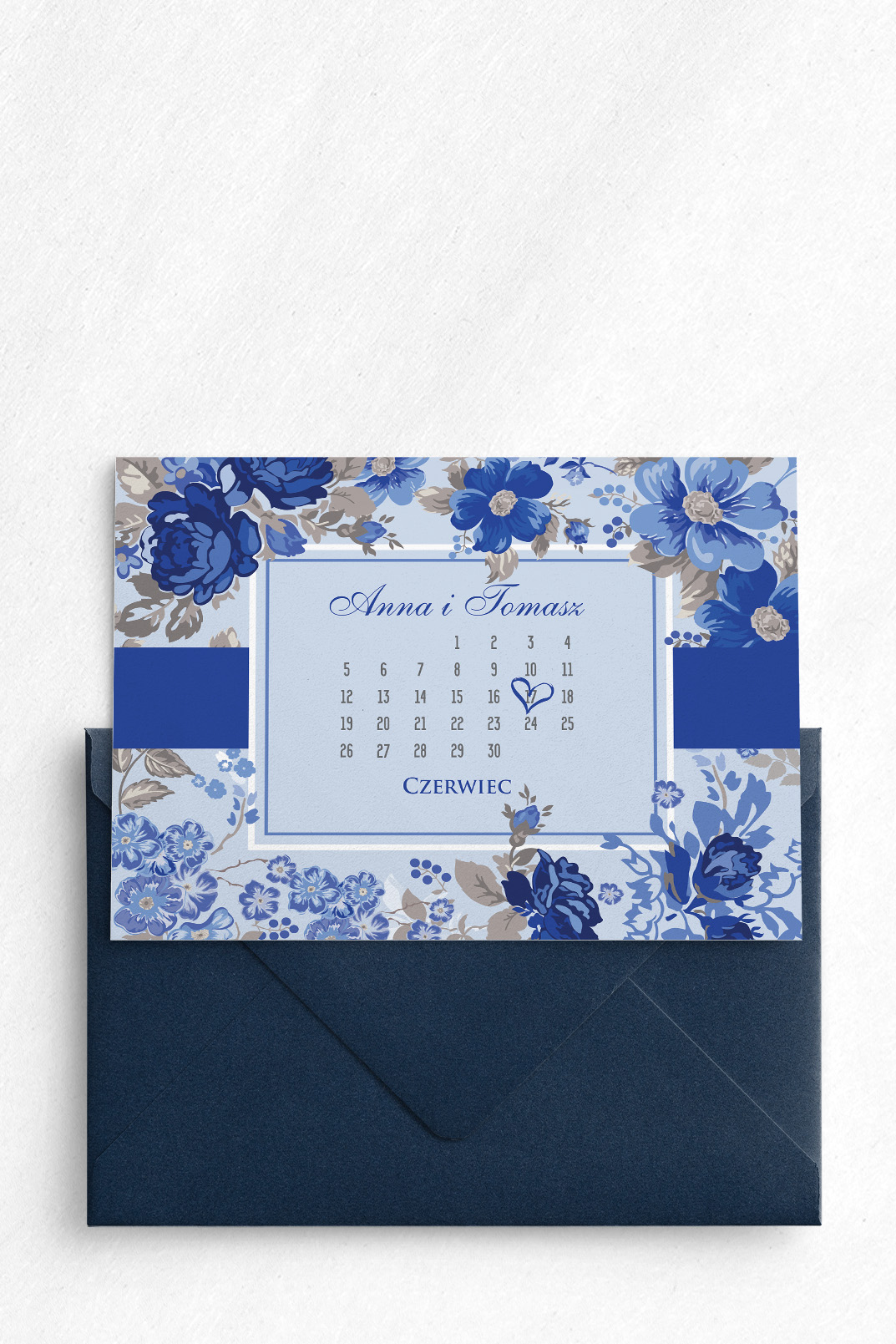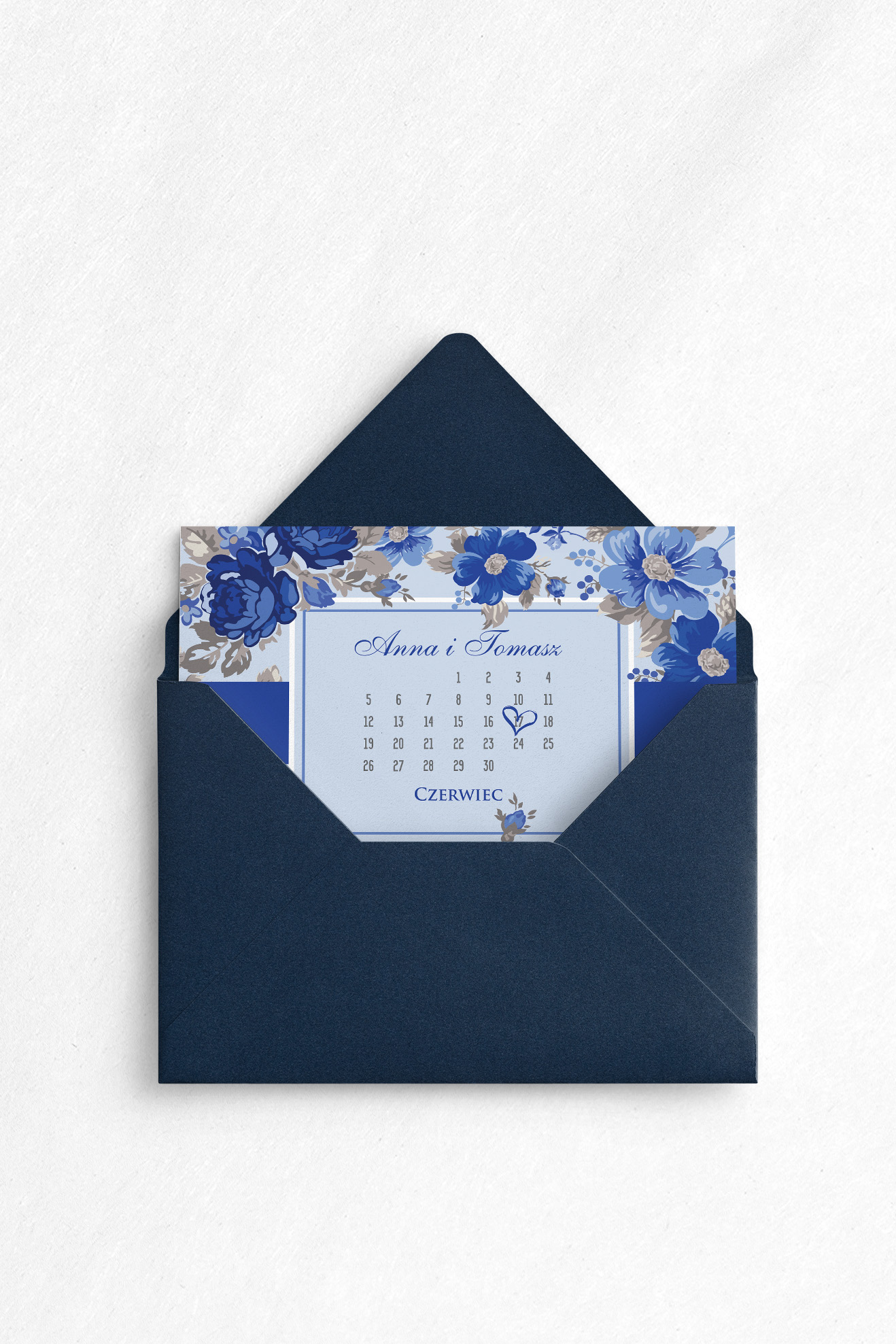 Zaproszenie na ślub z kolekcji Nasz Dzień, jest propozycją wykonaną w stylu karty z kalendarza. Jest oryginalnym pomysłem, gdyż na przodzie karty , zaznaczona jest data tego ważnego wydarzenia. Motyw 1 w kolorze granatowym doskonale współgra z białym tłem, wyróżniając przy tym najważniejsze informacje. Kwiatami które widnieją na zaproszeniu są granatowe rozwinięte róże. Dodatkowym elementem dodającym elegancji jest granatowy pasek. Poniżej możecie wybrać papier na jakim zostanie wykonane zaproszenie, rodzaje koperty oraz dodatkowe wkładki, które pięknie uzupełniają wzór.