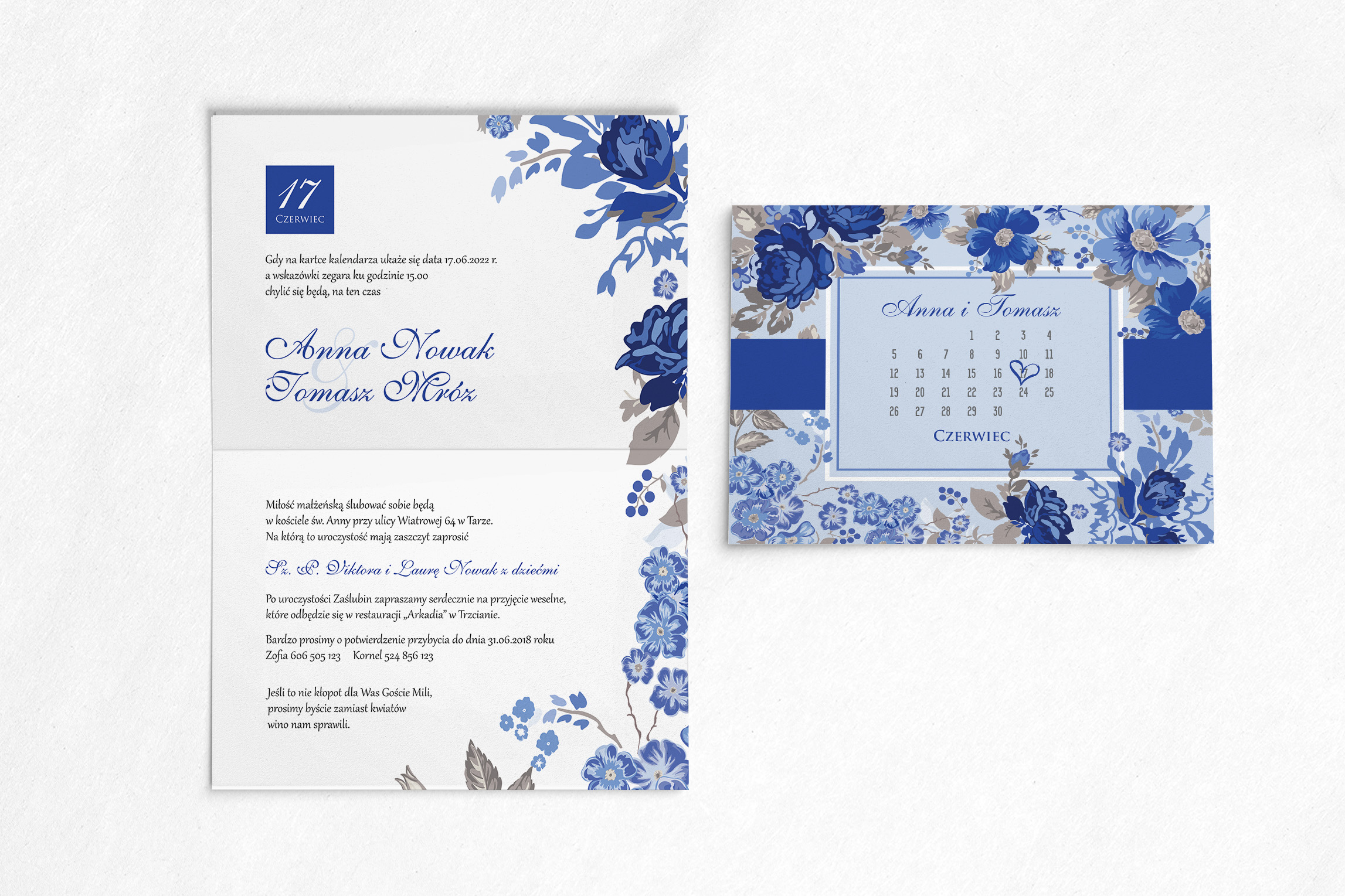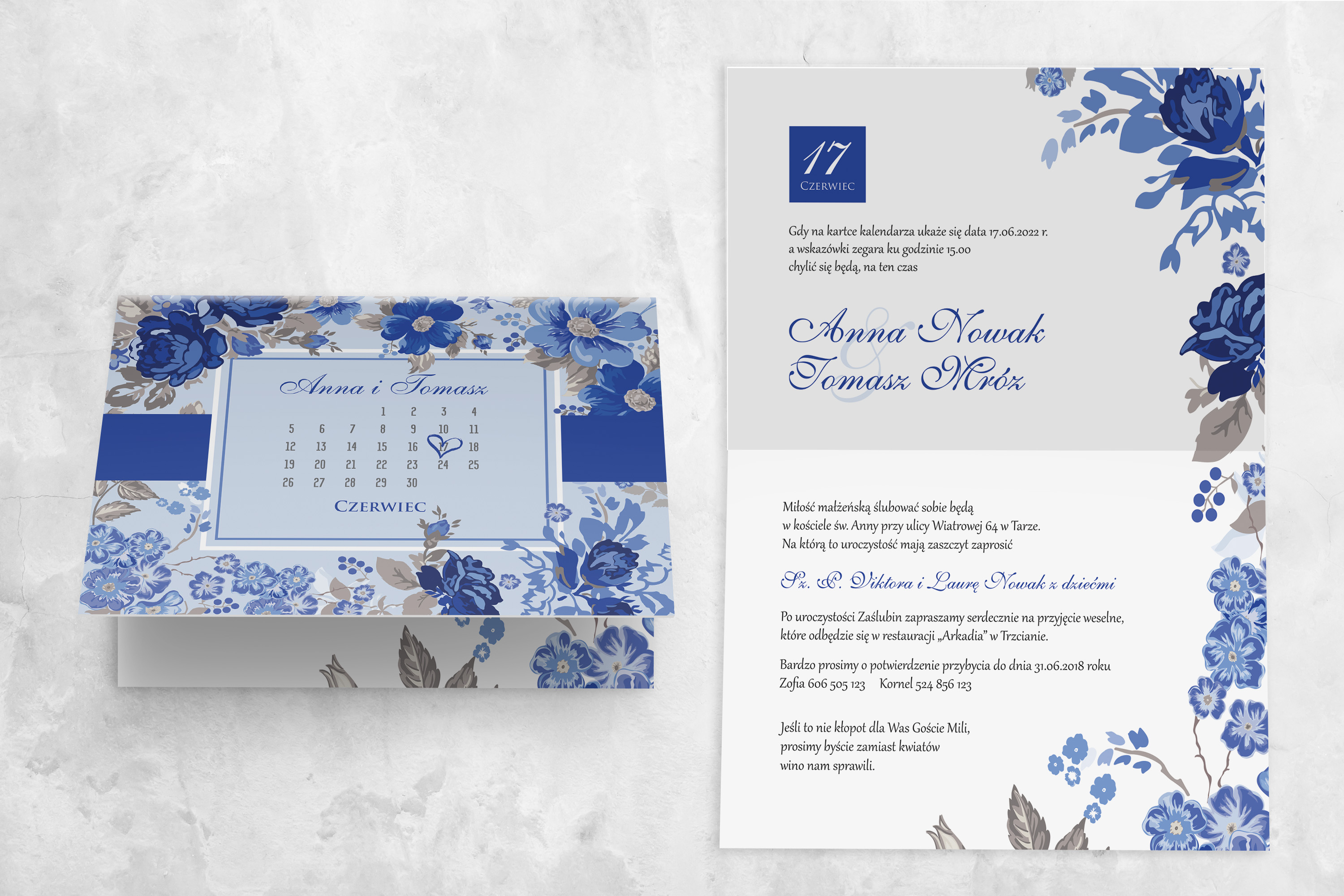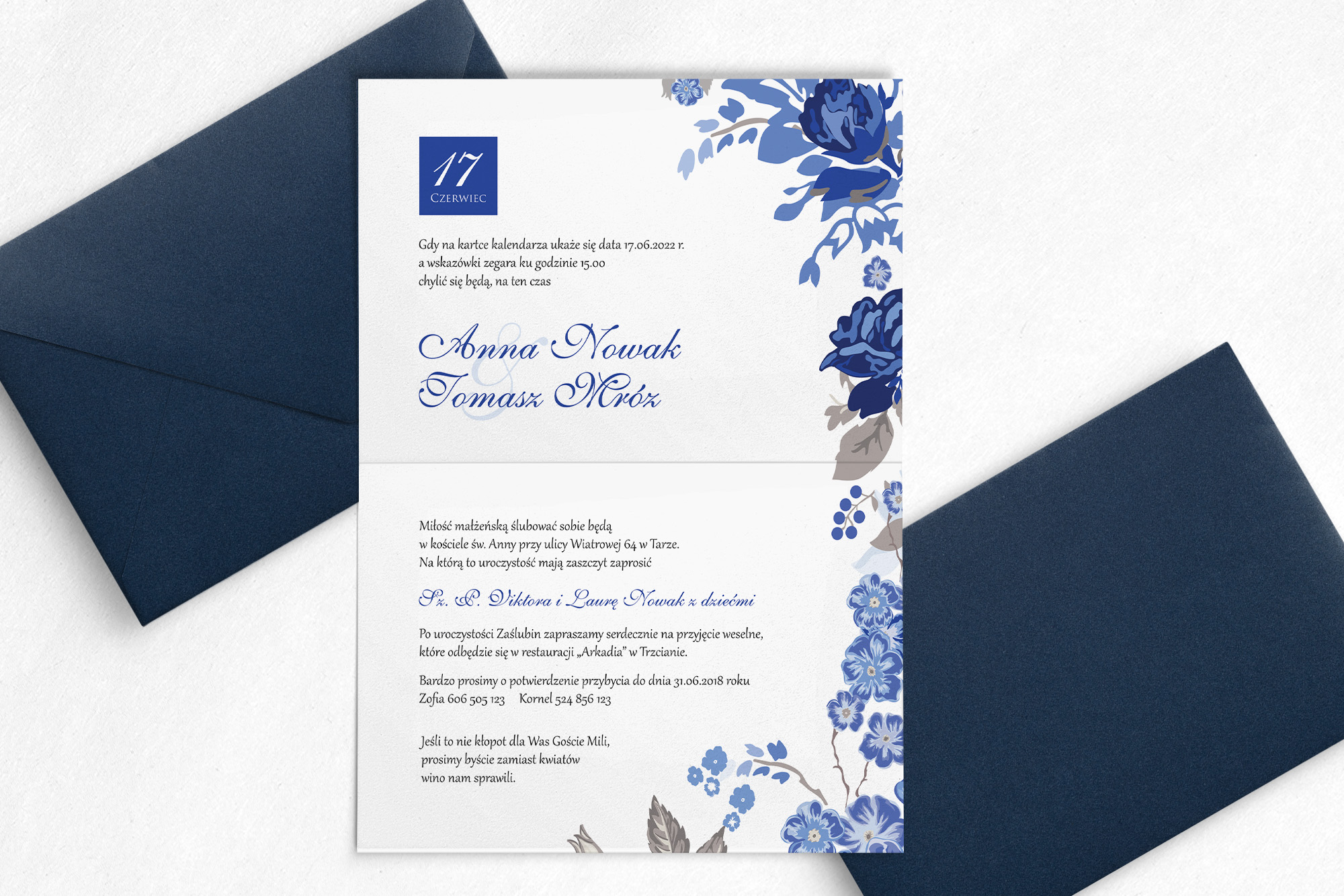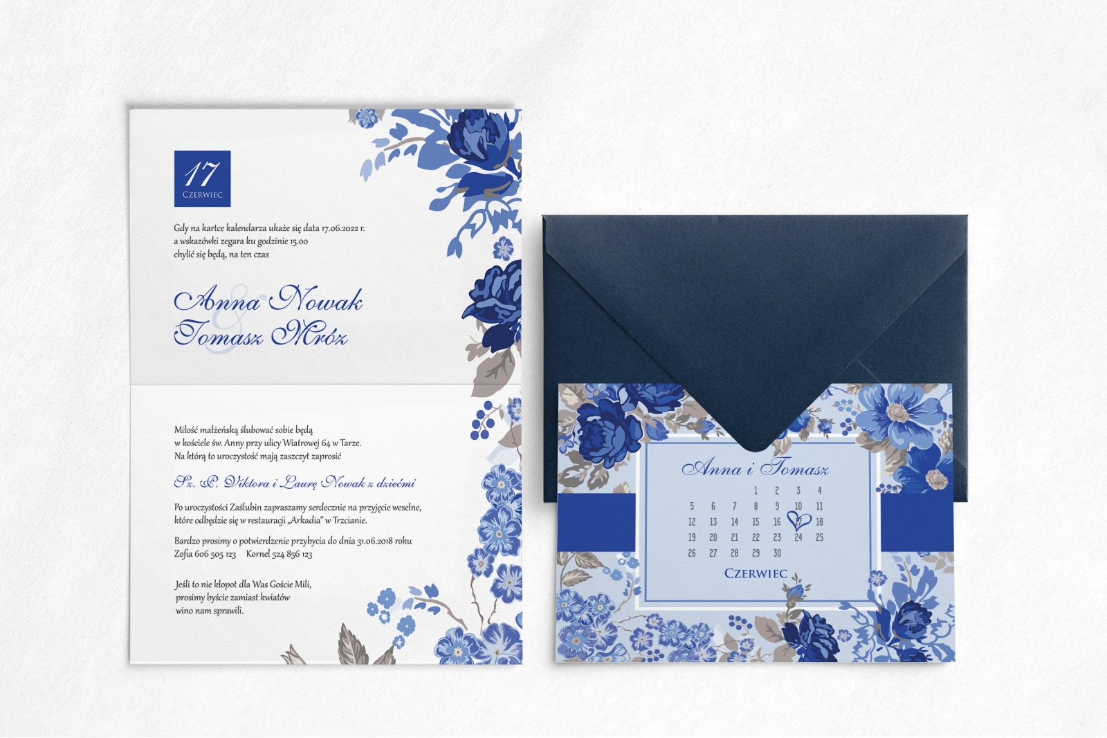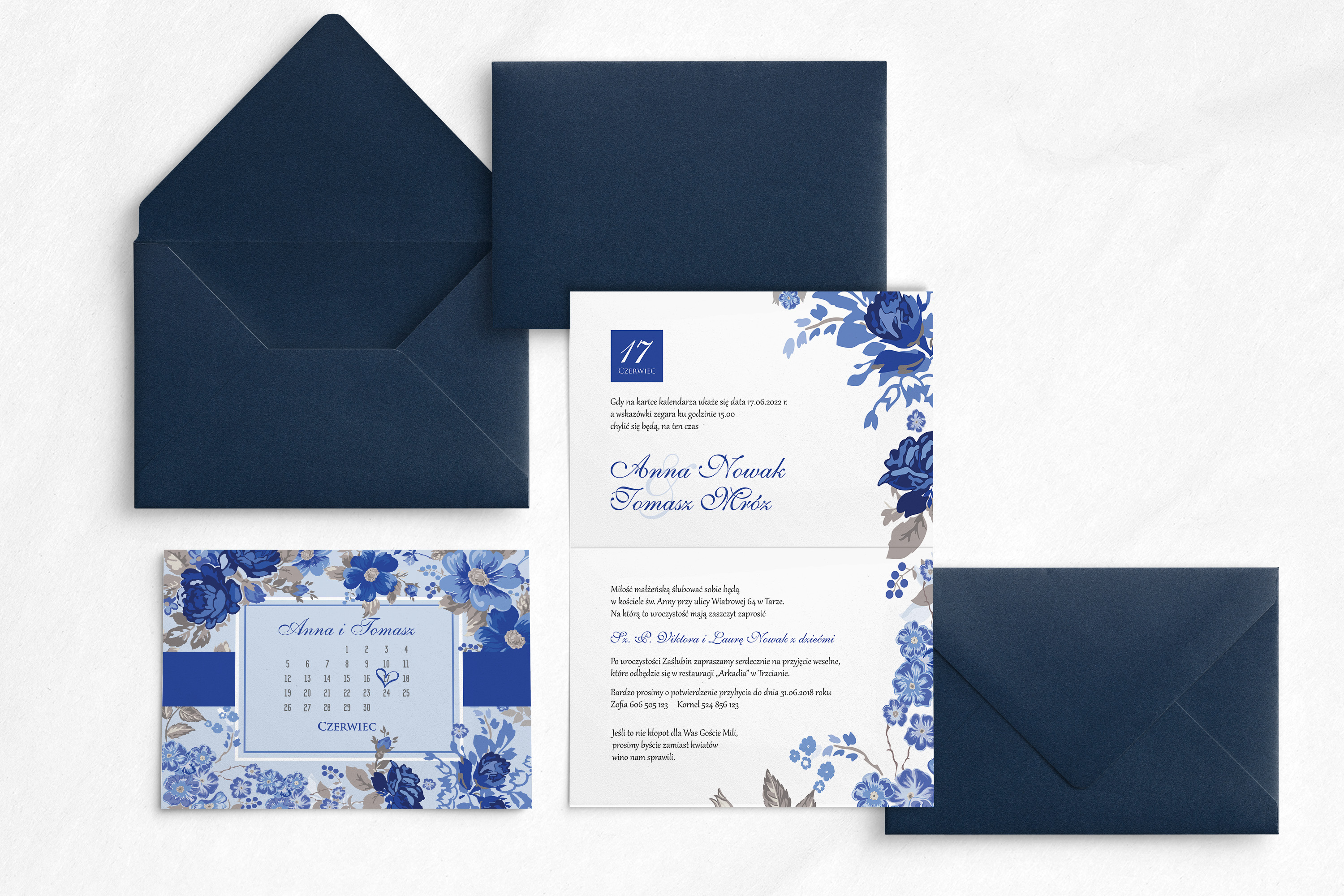 Zaproszenie na ślub z kolekcji Nasz Dzień, jest propozycją wykonaną w stylu karty z kalendarza. Jest oryginalnym pomysłem, gdyż na przodzie karty , zaznaczona jest data tego ważnego wydarzenia. Motyw 1 w kolorze granatowym doskonale współgra z białym tłem, wyróżniając przy tym najważniejsze informacje. Kwiatami które widnieją na zaproszeniu są granatowe rozwinięte róże. Dodatkowym elementem dodającym elegancji jest granatowy pasek. Poniżej możecie wybrać papier na jakim zostanie wykonane zaproszenie, rodzaje koperty oraz dodatkowe wkładki, które pięknie uzupełniają wzór.