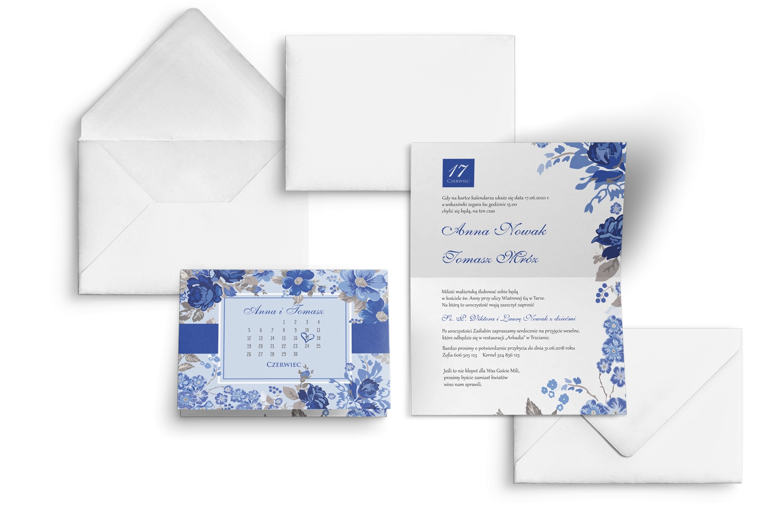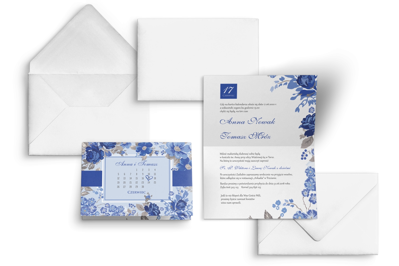 Zaproszenie na ślub z kolekcji Nasz Dzień, jest propozycją wykonaną w stylu karty z kalendarza. Jest oryginalnym pomysłem, gdyż na przodzie karty , zaznaczona jest data tego ważnego wydarzenia. Motyw 1 w kolorze granatowym doskonale współgra z białym tłem, wyróżniając przy tym najważniejsze informacje. Kwiatami które widnieją na zaproszeniu są granatowe rozwinięte róże. Dodatkowym elementem dodającym elegancji jest granatowy pasek. Poniżej możecie wybrać papier na jakim zostanie wykonane zaproszenie, rodzaje koperty oraz dodatkowe wkładki, które pięknie uzupełniają wzór.