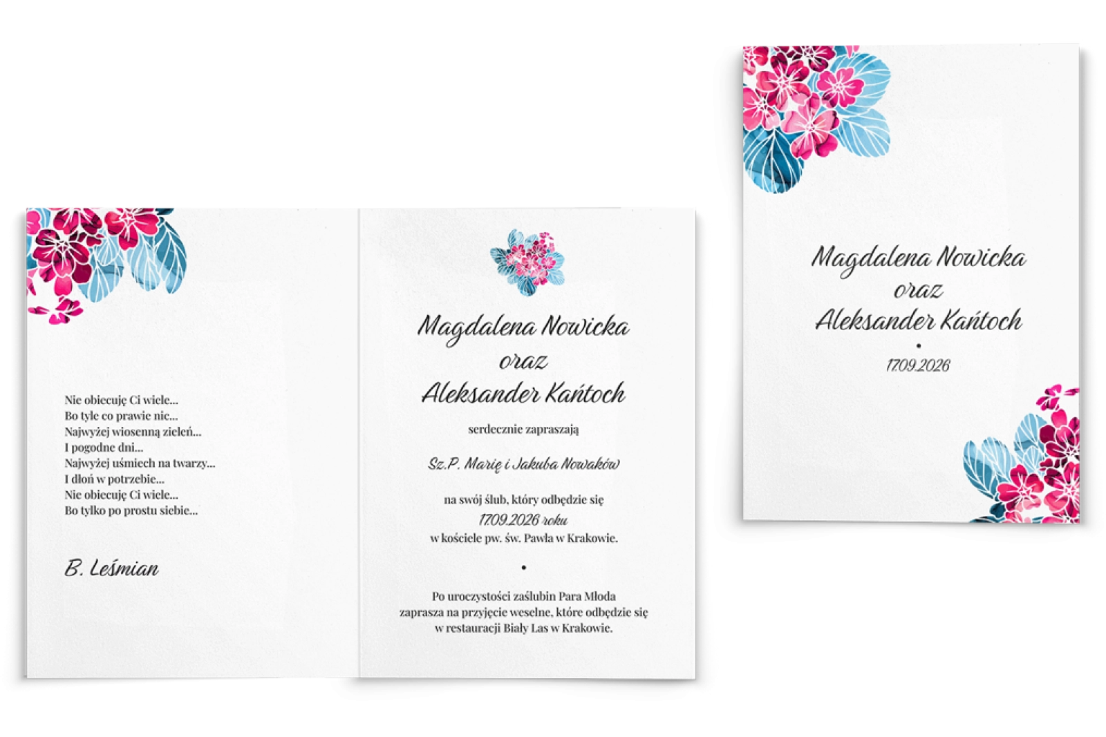 Wszystkie treści zaproszenia oraz dodatkowych wkładek są dowolnie personalizowane. Możesz zmienić każdą treść na swoim zaproszeniu. Podczas wypełniania Formularza Personalizacji opisz nam jak chcesz, aby wyglądało Twoje zaproszenie. Grafik przygotuje projekt skrojony specjalnie dla Ciebie.