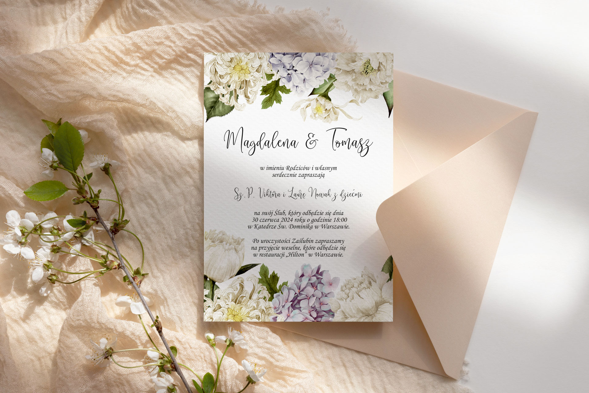 Piękne zaproszenia ślubne z jasnymi kwiatami chryzantem, bzu i peoni. Niezwykłe połączenie kwiatów o jasnych barwach tworzą ciekawą kompozycję. Sprawdź wszystkie możliwości personalizacji tego wzoru.