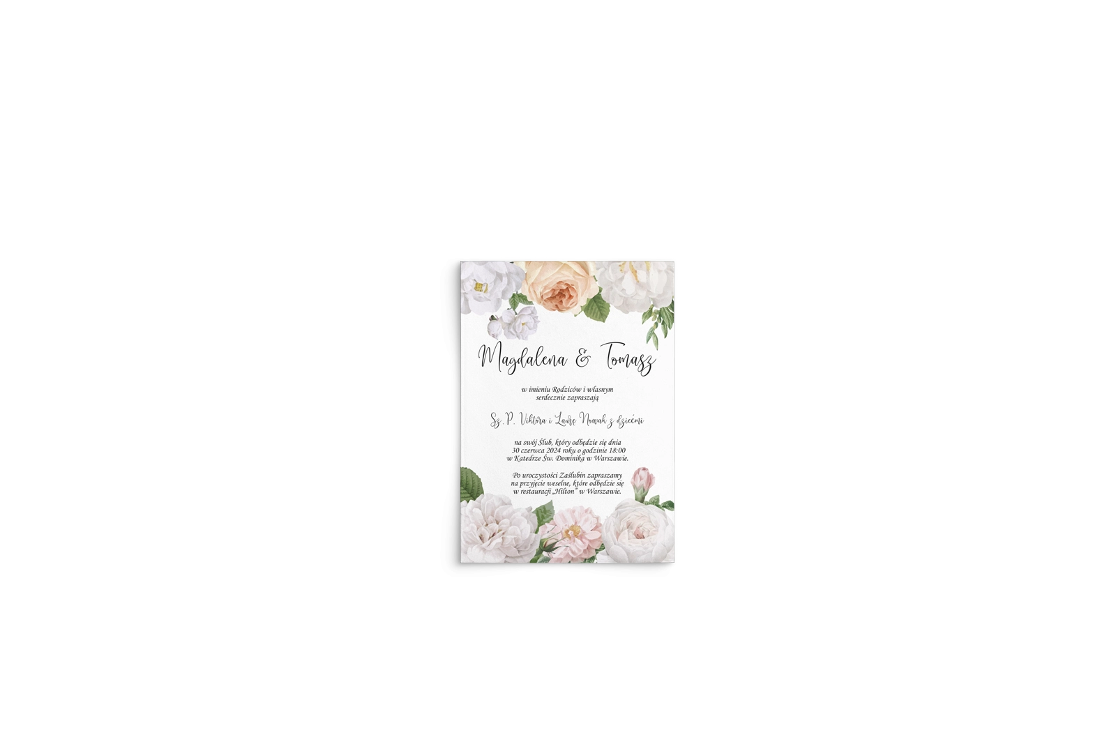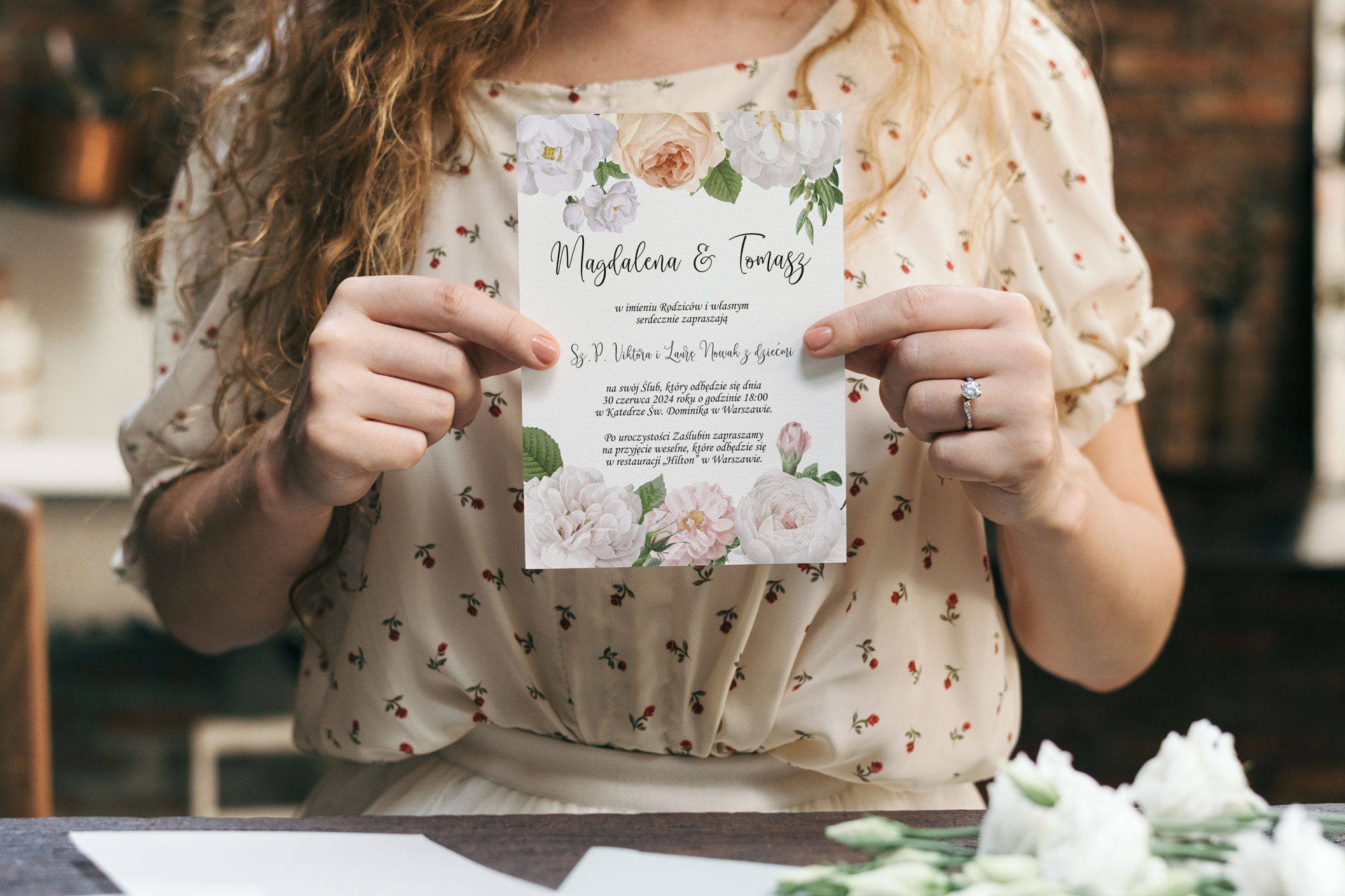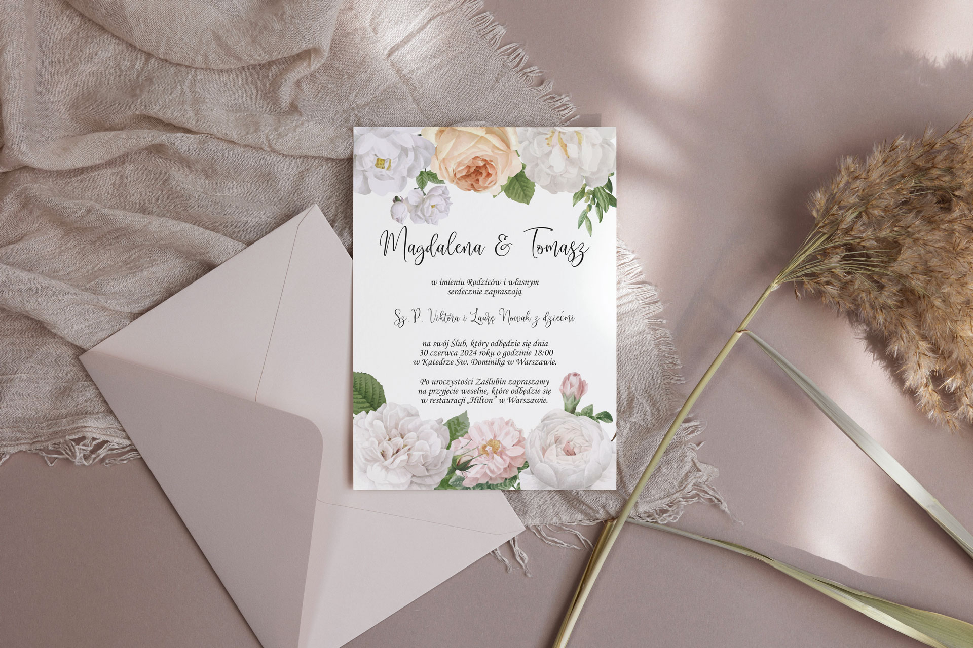 Piękne zaproszenia ślubne z jasnymi kwiatami peoni, gerbera i róży. Niezwykłe połączenie kwiatów o jasnych barwach tworzą ciekawą kompozycję. Sprawdź wszystkie możliwości personalizacji tego wzoru.