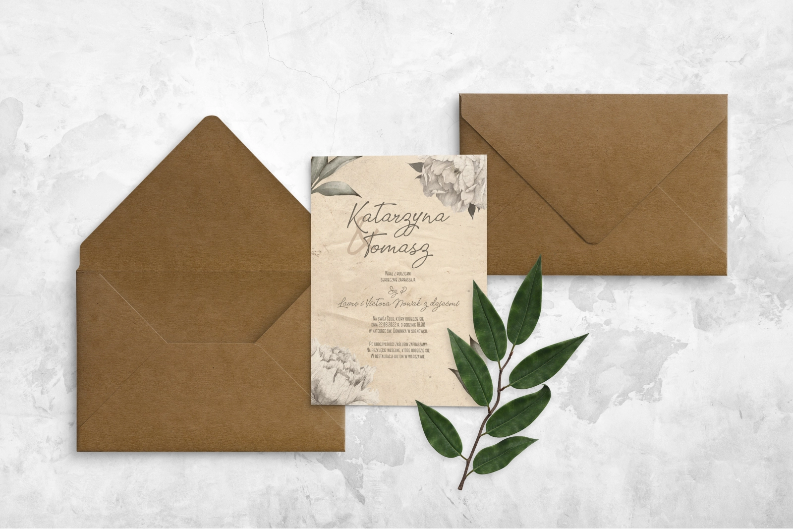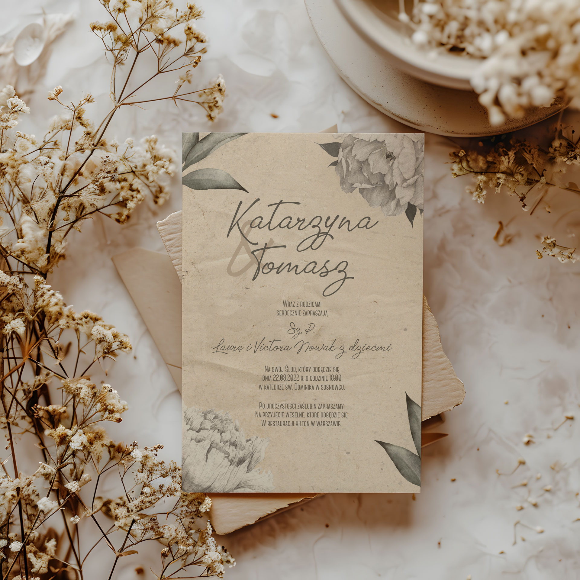 Nowoczesne zaproszenia ślubne w postarzanej scenerii.