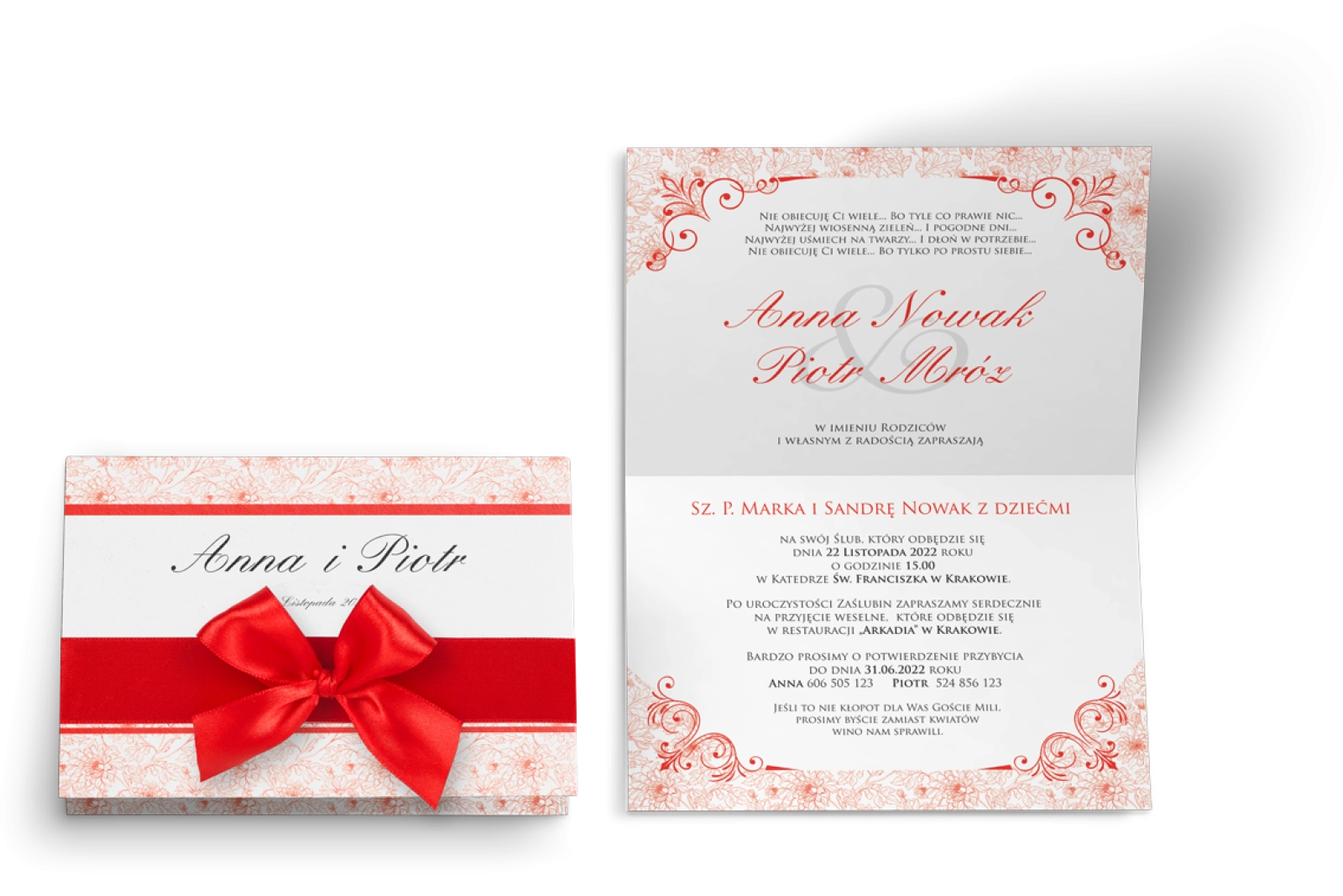 Zaproszenie ślubne Ornaments to elegancja propozycja stworzona w kolorze czerwonym. Główna karta zaproszenia wykonana jest z wysokich jakości papierów o gramaturze od 246 gr do 300 gr. Sami możecie wybrać ich strukturę. Główną aplikacją jest wstążka satynowa przyklejona do zaproszenia w postaci paska, na którym spoczywa misternie i dokładnie zawiązana kokarda. Jako dodatki do tego wzoru możecie wybrać kopertę zwykłą lub koperty krzyżowe z piękną wklejką i kolorową personalizacją. Aby zaproszenie było jeszcze ciekawe polecamy dodać do niego dodatkowe wkładki.