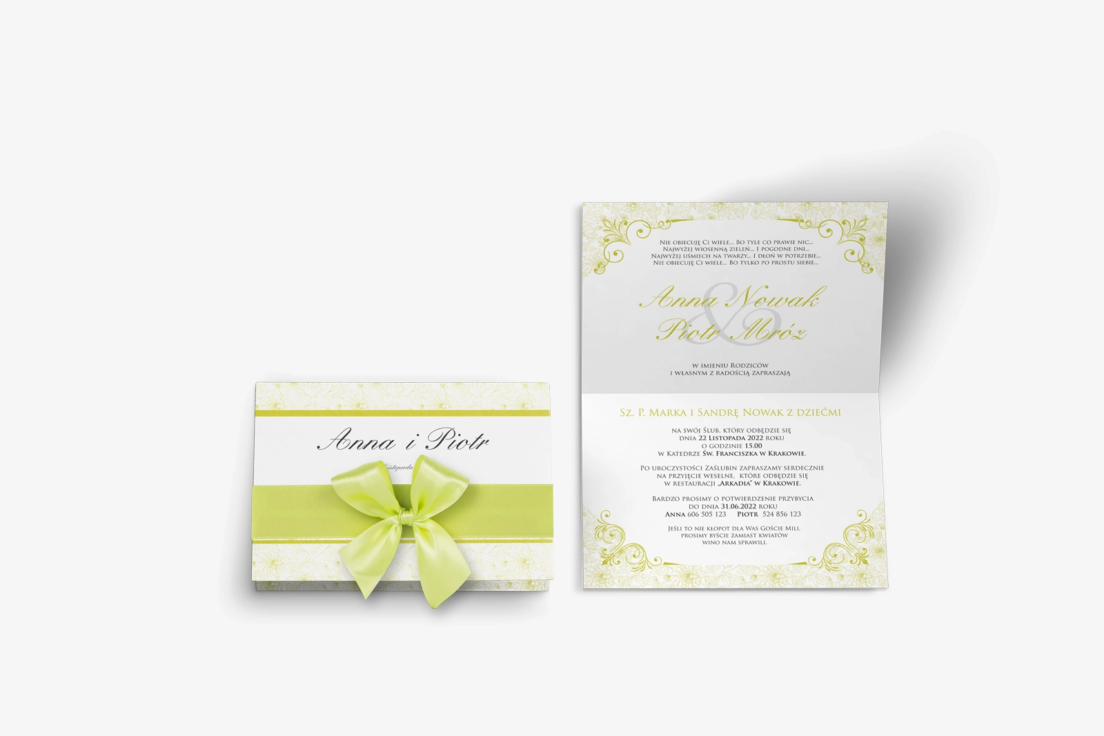 Wszystkie treści zaproszenia oraz dodatkowych wkładek są dowolnie personalizowane. Możesz zmienić każdą treść na swoim zaproszeniu. Podczas wypełniania Formularza Personalizacji opisz nam jak chcesz, aby wyglądało Twoje zaproszenie. Grafik przygotuje projekt skrojony specjalnie dla Ciebie.