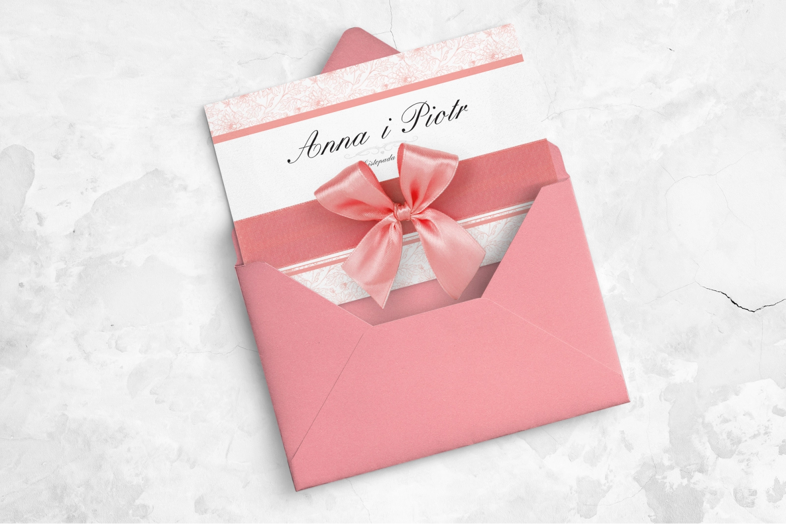 Zaproszenie ślubne Ornaments to elegancja propozycja stworzona w kolorze różowym. Główna karta zaproszenia wykonana jest z wysokich jakości papierów o gramaturze od 246 gr do 300 gr. Sami możecie wybrać ich strukturę. Główną aplikacją jest wstążka satynowa przyklejona do zaproszenia w postaci paska, na którym spoczywa misternie i dokładnie zawiązana kokarda. Jako dodatki do tego wzoru możecie wybrać kopertę zwykłą lub koperty krzyżowe z piękną wklejką i kolorową personalizacją. Aby zaproszenie było jeszcze ciekawe polecamy dodać do niego dodatkowe wkładki.