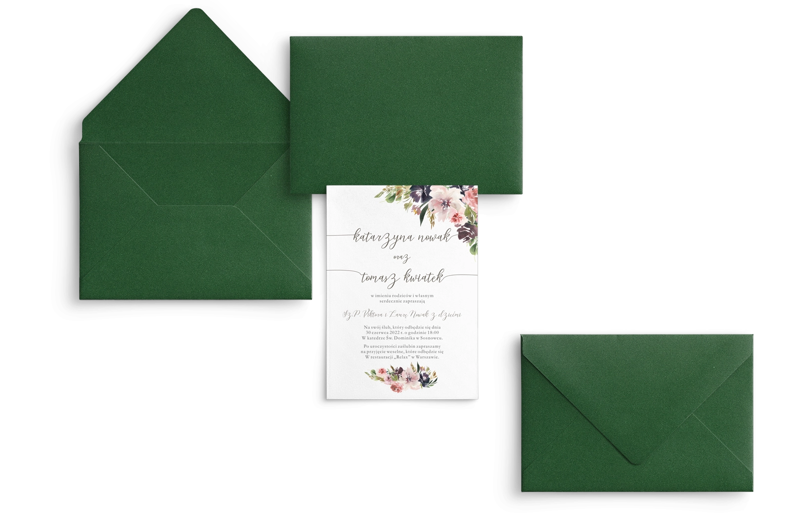 Wszystkie treści zaproszenia oraz dodatkowych wkładek są dowolnie personalizowane. Możesz zmienić każdą treść na swoim zaproszeniu. Podczas wypełniania Formularza Personalizacji opisz nam jak chcesz, aby wyglądało Twoje zaproszenie. Grafik przygotuje projekt skrojony specjalnie dla Ciebie.